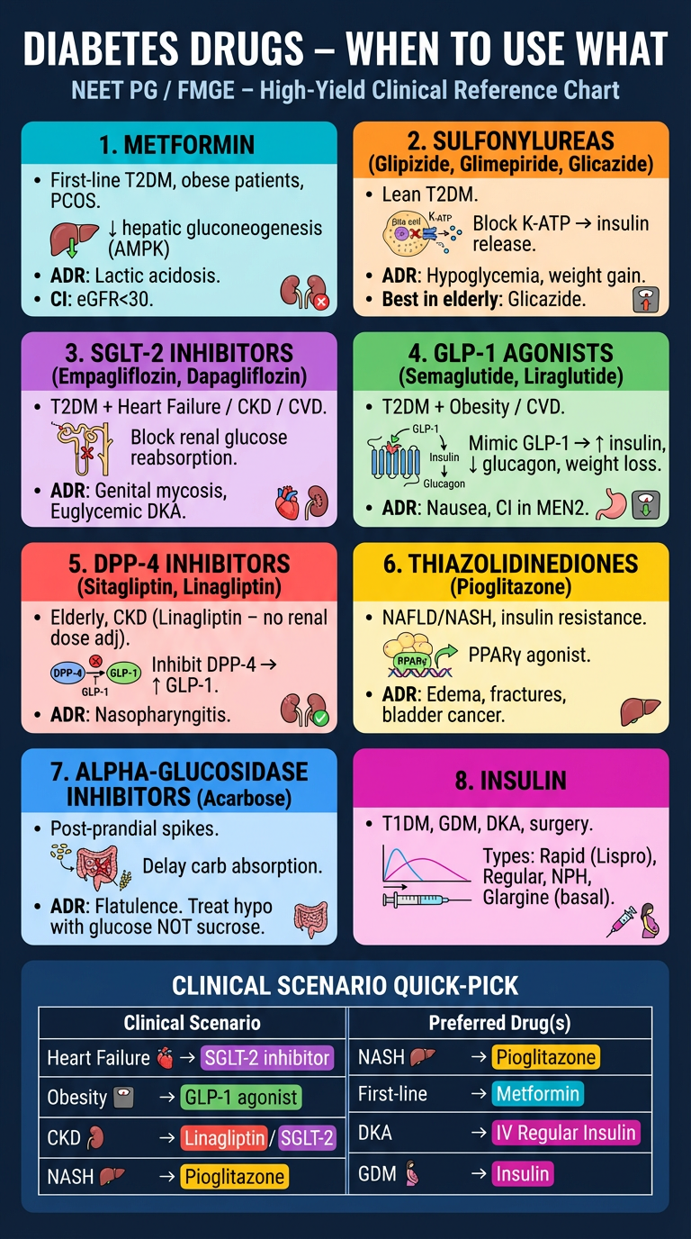 Every antidiabetic drug has a "clinical niche" — knowing WHEN to use which drug is the examiner's favorite.