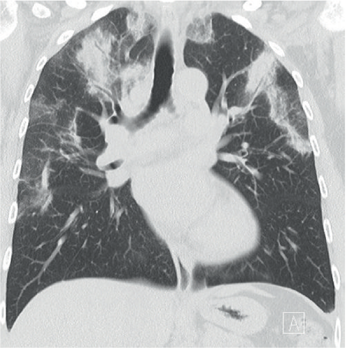 Fig: Coronal CT reconstruction — upper-zone peripheral airspace opacification paralleling the chest wall in CEP (Grainger & Allison's Diagnostic Radiology)