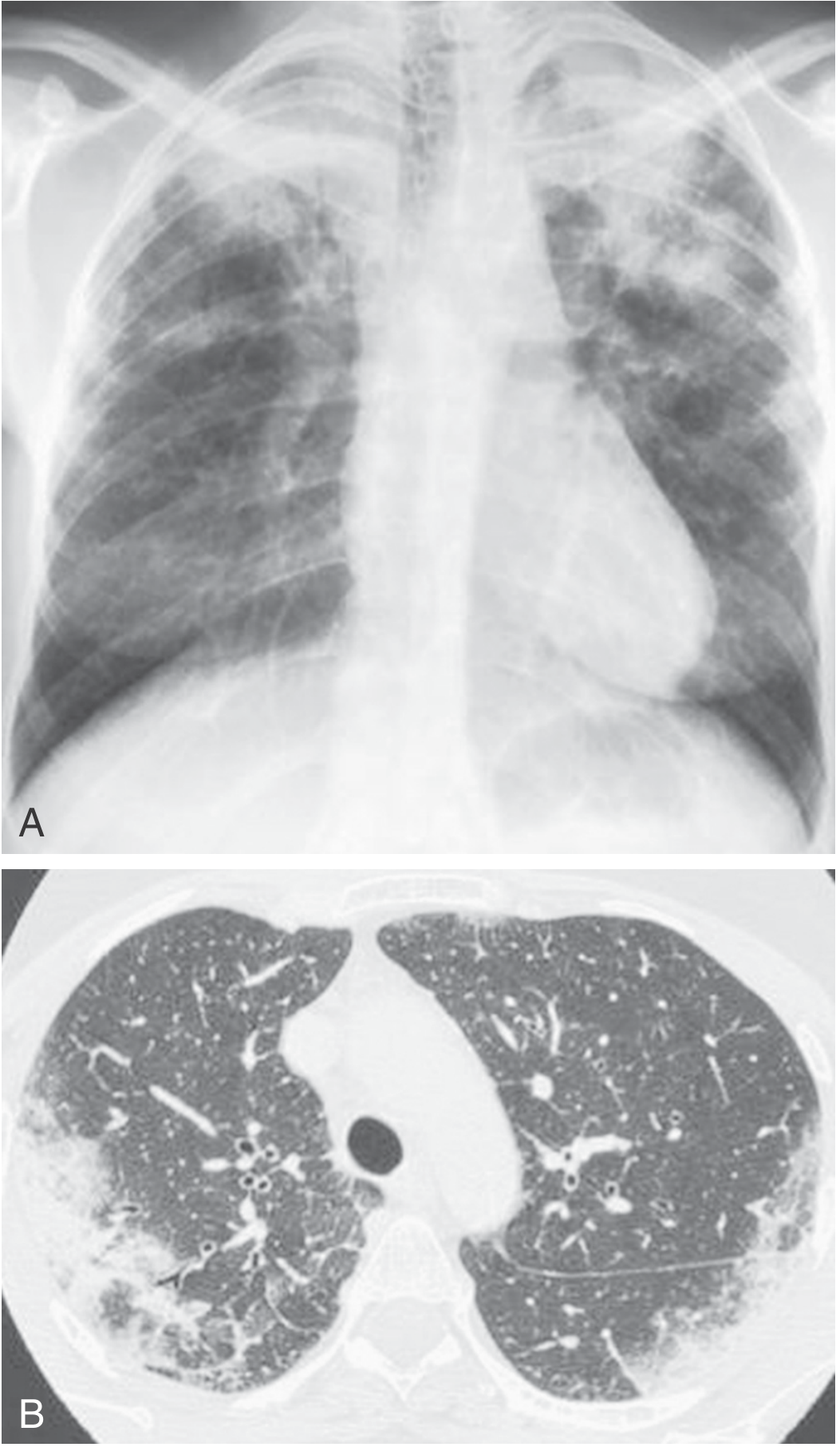 Fig: CXR (A) bilateral upper-lobe opacities; HRCT (B) symmetrical peripheral opacities in ICEP (Murray & Nadel's)