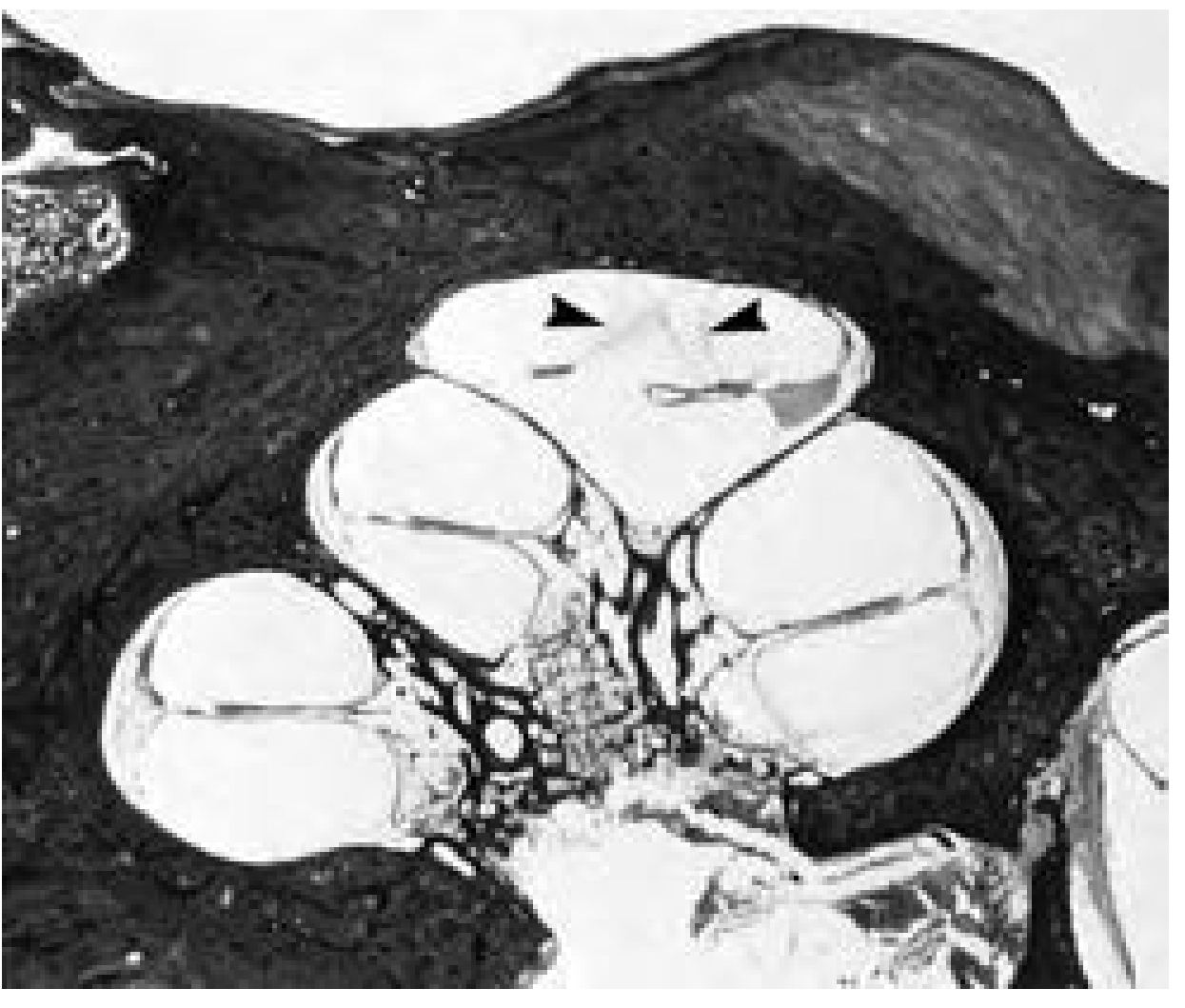 - Temporal bone studies showed hydrops and membrane ruptures isolated to basal cochlear turns and saccule