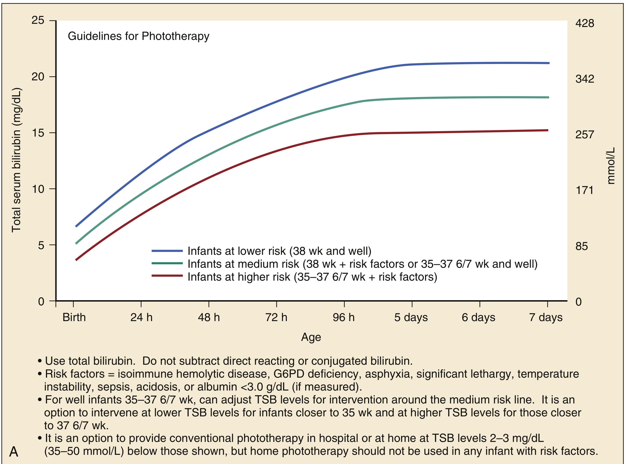 Risk factors that lower threshold: isoimmune hemolytic disease, G6PD deficiency, asphyxia, significant lethargy, temperature instability, sepsis, acidosis, albumin <3.0 g/dL.