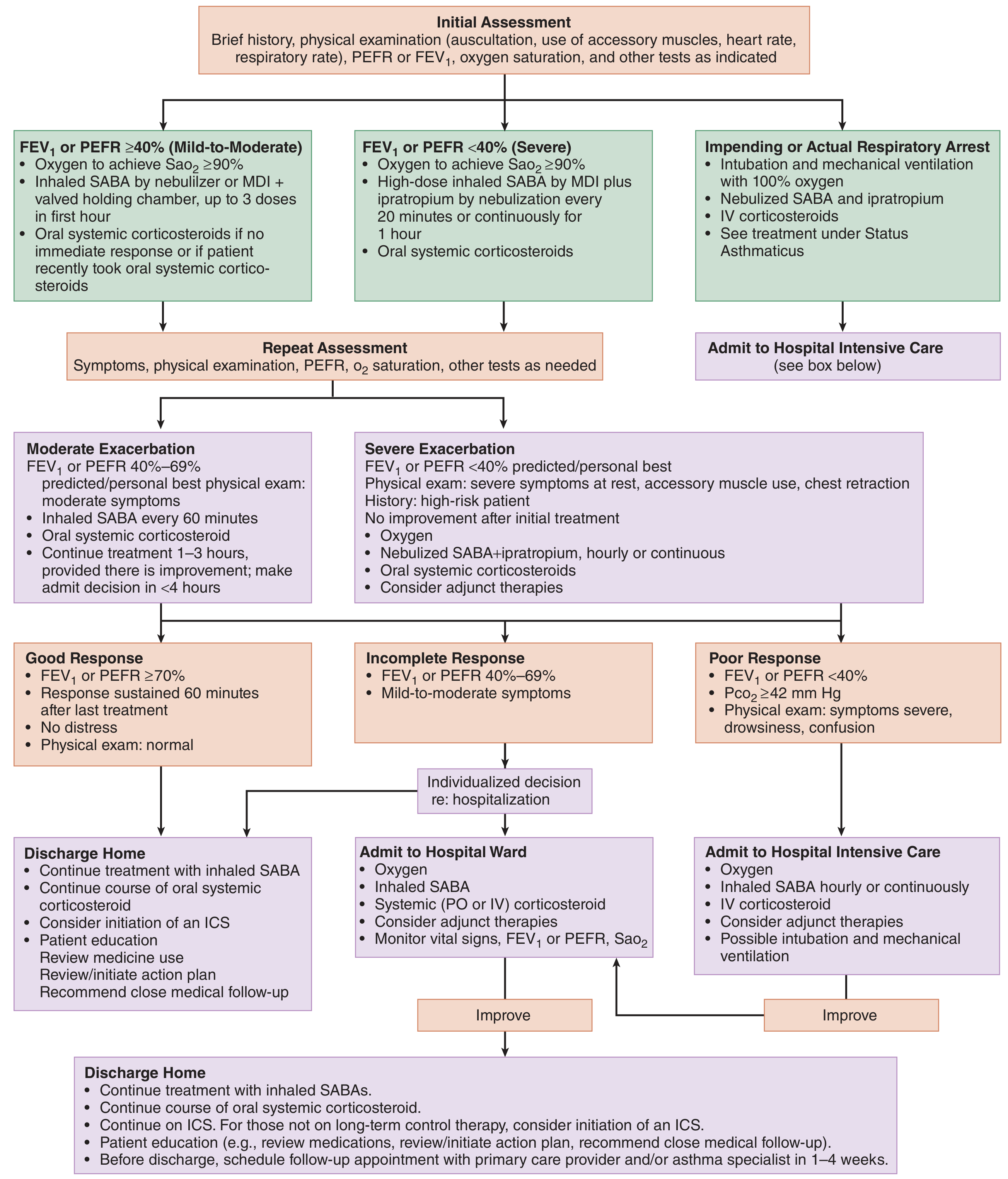Discharge criteria (Good response): FEV₁/PEFR ≥70%, sustained 60 min after last treatment, no distress. Discharge with: continued SABA, oral corticosteroid course, ICS initiation, follow-up in 1–4 weeks.