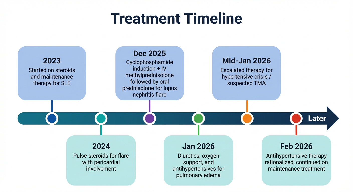 Q: Make this timeline much more presentable A: Here's your redesigned treatment timeline: !Treatment Timelinehttps://cdn.orris.care/image-gen/83eeda1836e940a3a212a5ed5149a49c.png Key improvements over the original: - Alternating layout — nodes alternate above and below the timeline, eliminating the cramped single-row design and giving each event more breathing room - Color-coded cards — distinct background colors for above/below nodes make it easier to visually track each event - Modern styling — rounded cards, bold circular markers, and a deep teal gradient timeline bar replace the flat dashed line and plain boxes - Better typography — cleaner hierarchy between dates and descriptions - Less clutter — the layout naturally spreads content horizontally without overlapping labels