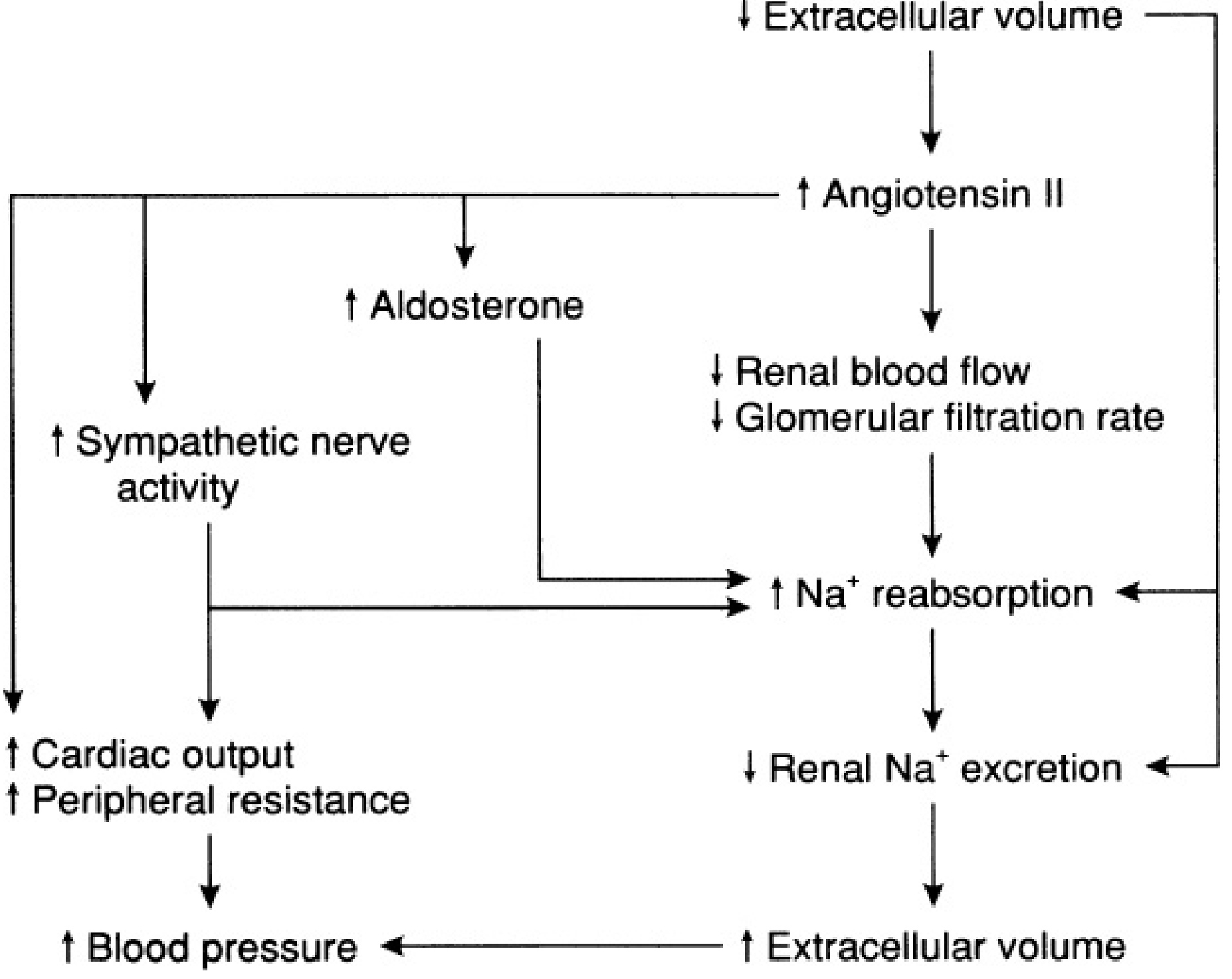 Fig. 11.5 — Mulholland & Greenfield's Surgery 7e: Effects of ↑ Angiotensin II in response to ↓ ECF volume.