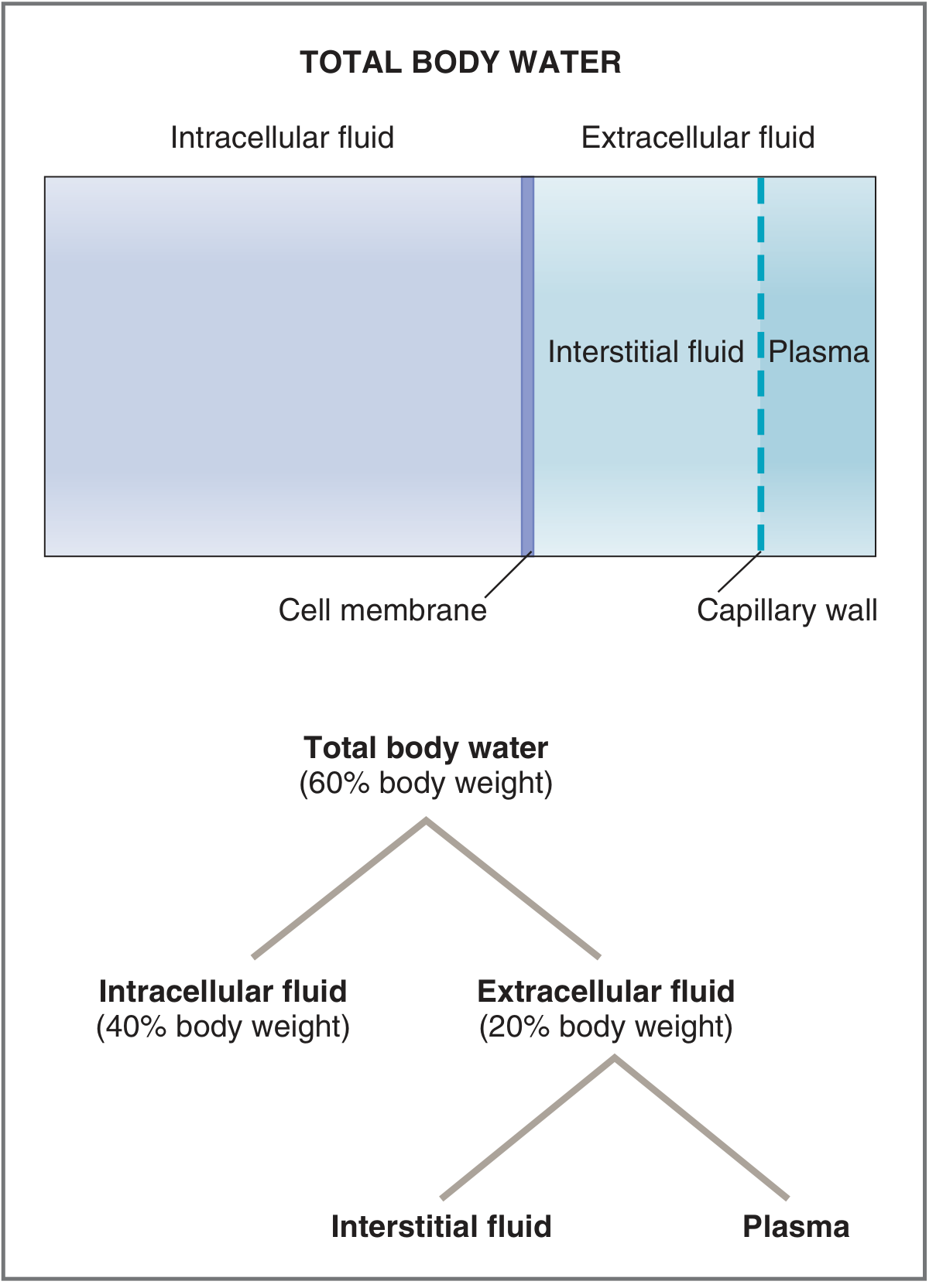 | Insensible losses (skin 75%, lungs 25%) | ~600 mL |