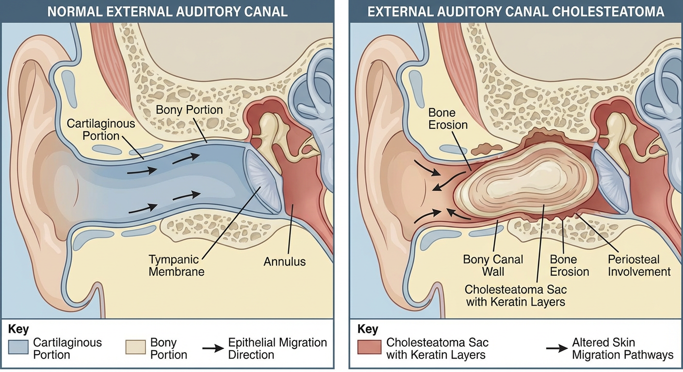 External Ear Canal Cholesteatoma (EECC) is a benign, locally destructive lesion of the external auditory canal (EAC), characterized by an accumulation of exfoliated keratin debris within a keratinizing squamous epithelial sac that has lost its normal migratory capacity. Despite the suffix "-oma," it is not a true neoplasm but a dyskeratotic process.