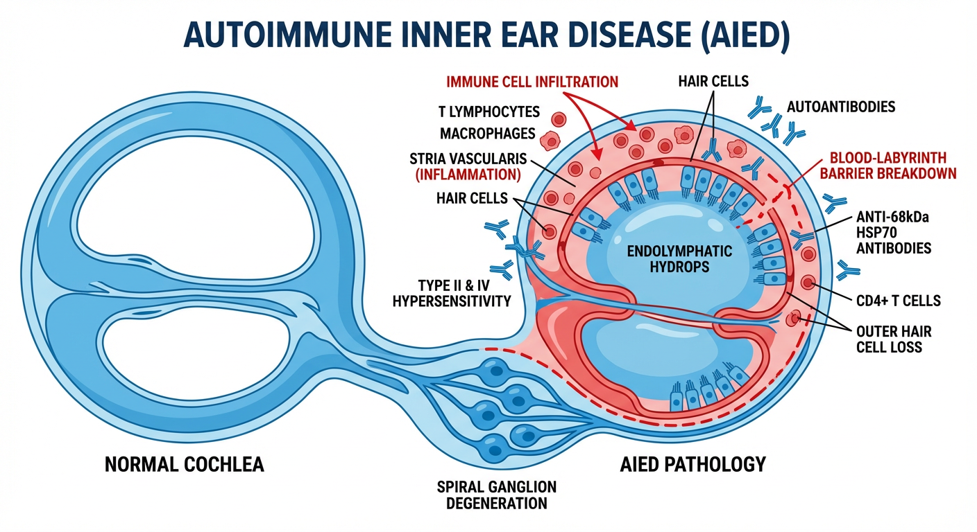The ear, particularly the inner ear (labyrinth), is an immunologically privileged site — yet it is vulnerable to autoimmune attack due to its unique blood-labyrinth barrier (BLB), specialized endolymphatic immune system, and molecular mimicry. Autoimmune diseases of the ear were first systematically described by McCabe (1979) who coined the term Autoimmune Inner Ear Disease (AIED) after observing bilateral progressive sensorineural hearing loss (SNHL) that responded to immunosuppressive therapy.
