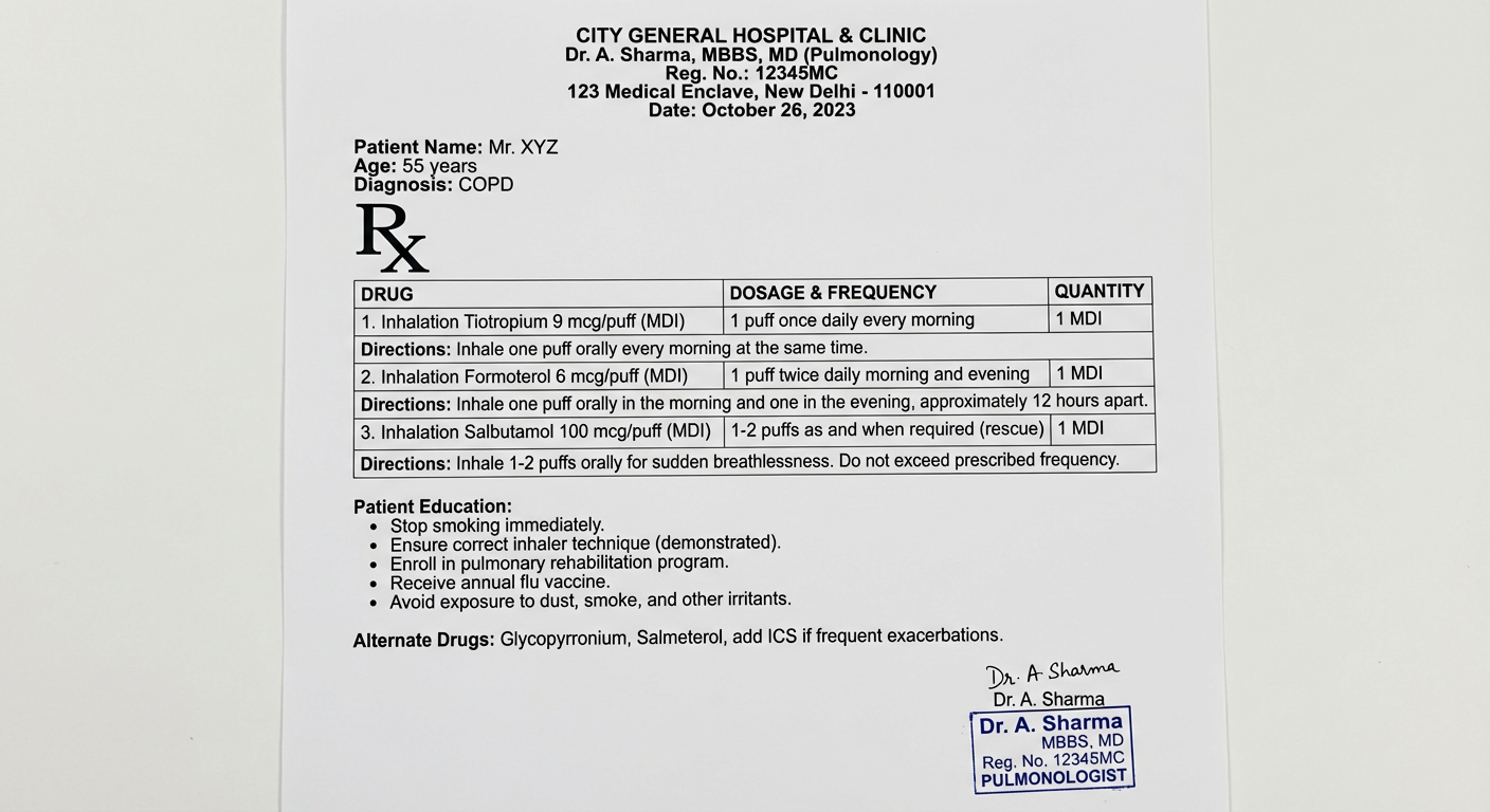 Name: Mr./Ms. ___________ Age: ___ years | Date: ___________ Diagnosis: Chronic Obstructive Pulmonary Disease (COPD)Rx