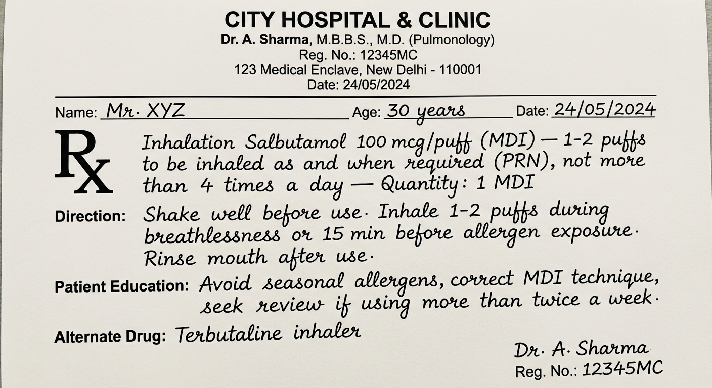 Drug Dose Quantity Inhalation Salbutamol 100 mcg/puff (MDI) 1–2 puffs to be inhaled as and when required (PRN), not more than 4 times a day __(1 MDI) Direction: Shake inhaler well before use. Inhale 1–2 puffs during symptomatic episodes or 15 minutes before known allergen/trigger exposure. Rinse mouth after use.Patient Education: