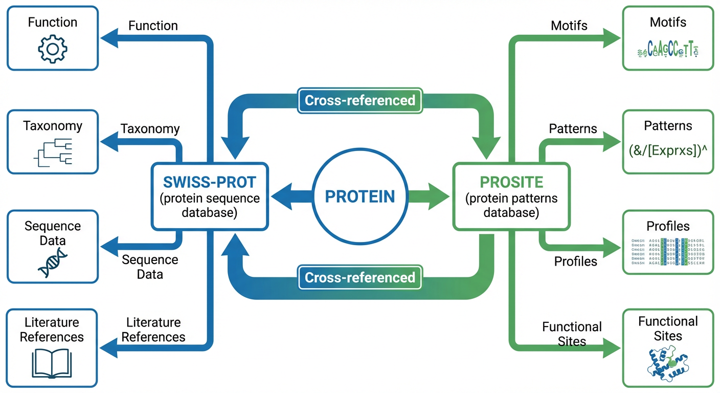 - Educational role: SWISS-PROT teaches protein biology details; PROSITE teaches motif logic and conserved functional sites.