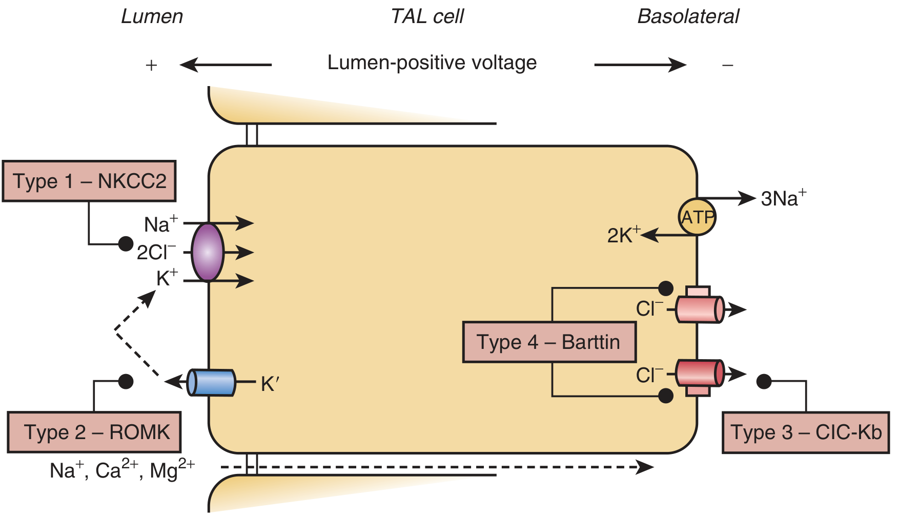 TAL cell showing transport systems disrupted in each Bartter type — Brenner & Rector's The Kidney