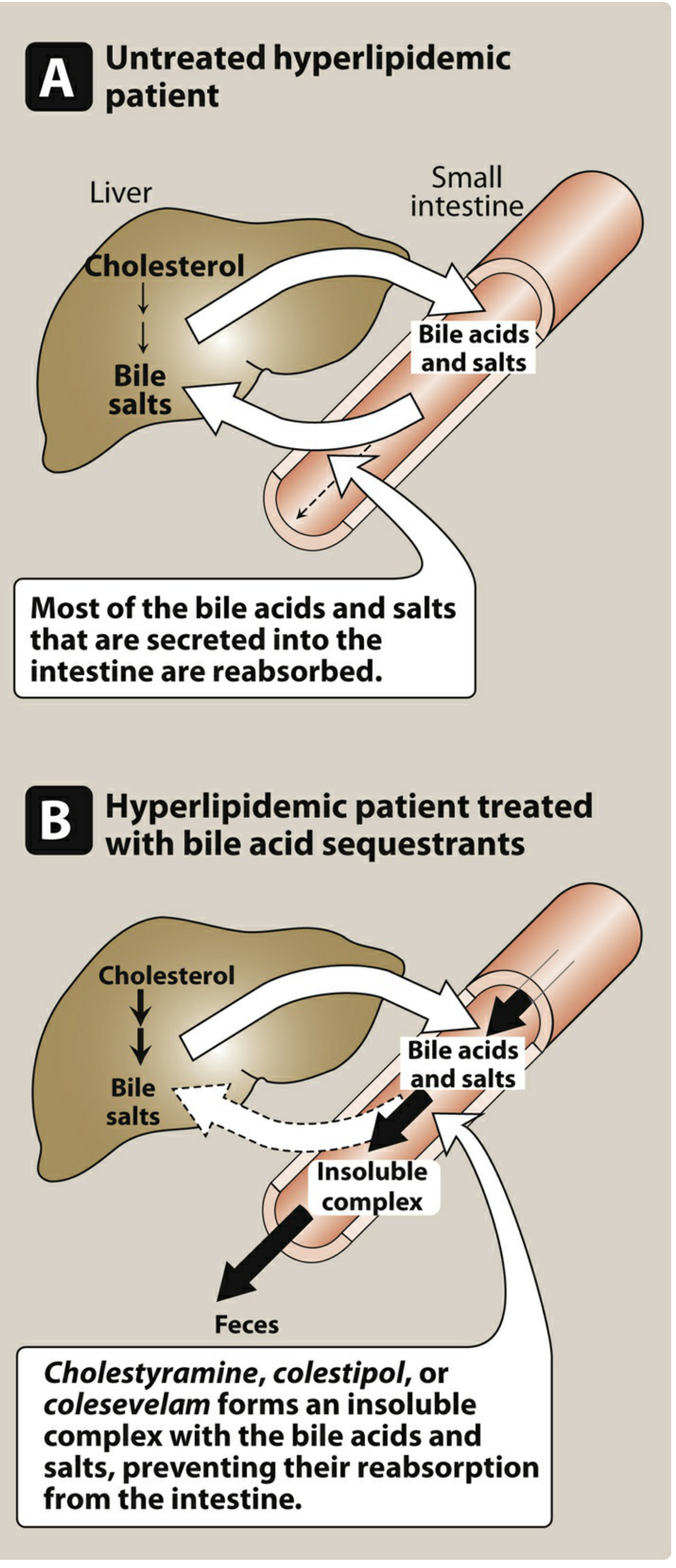 Mechanism: Non-absorbable resins that bind bile acids in the intestinal lumen → prevent their enterohepatic recycling → liver uses more cholesterol to synthesize new bile acids → upregulates LDL receptors → ↓ plasma LDL-C