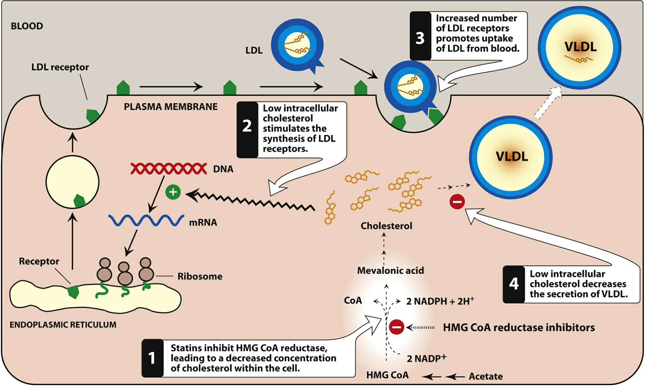 - Low intracellular cholesterol → upregulation of LDL receptors on hepatocyte surface