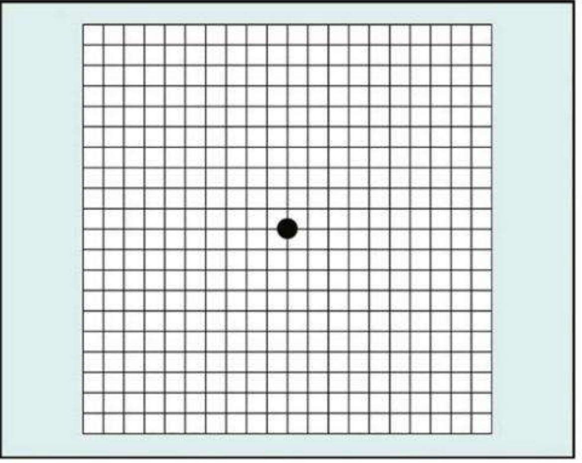 - Patient fixates the central dot and reports any distortion, waviness, blurring, or missing areas