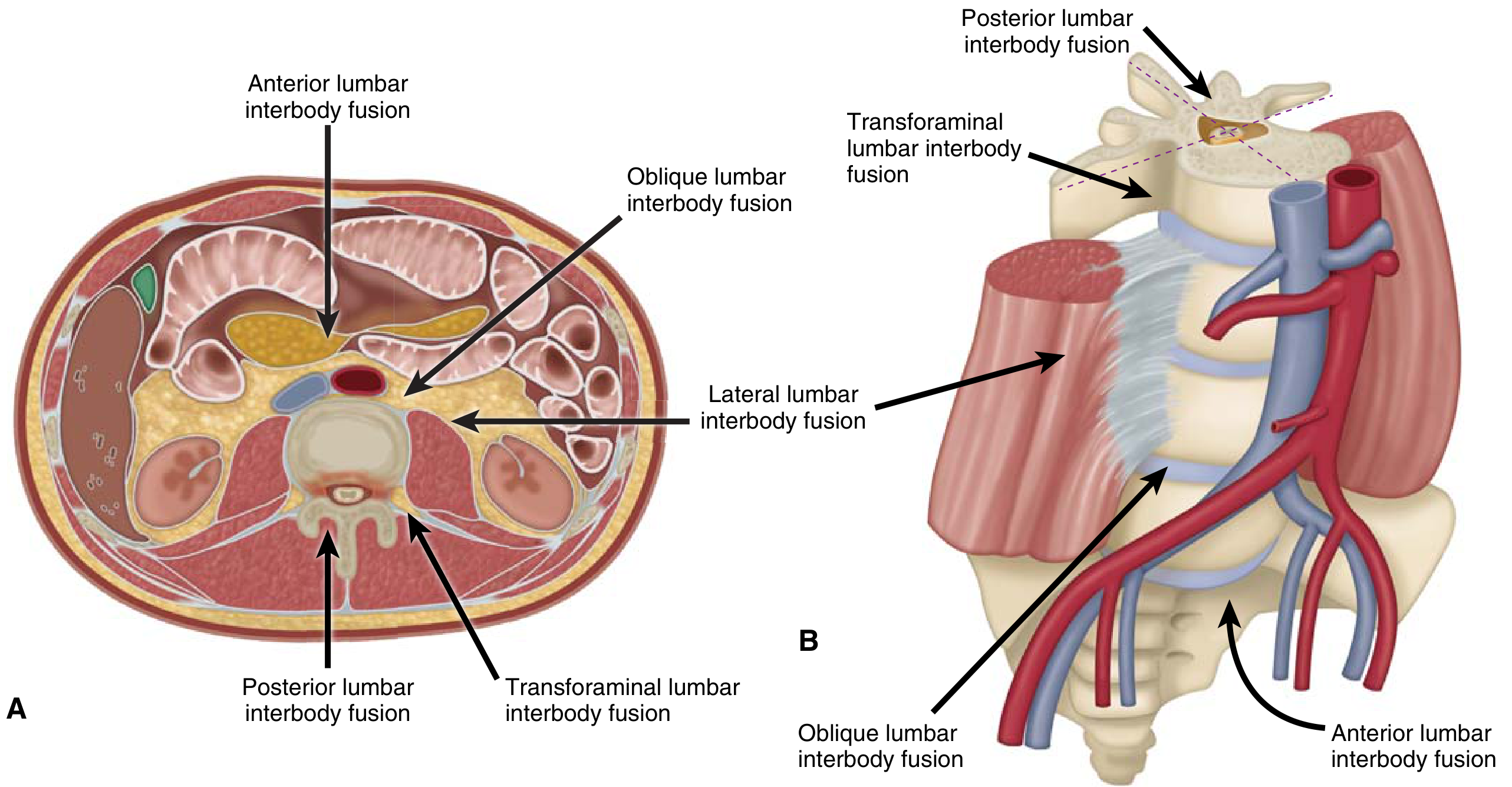 FIG. 8.15 — Trajectories for lumbar interbody fusion techniques. (A) Axial cut at lumbar disc space. (B) 3D representation of interbody corridors. (Modified from Mobbs et al., 2015, Journal of Spine Surgery)
