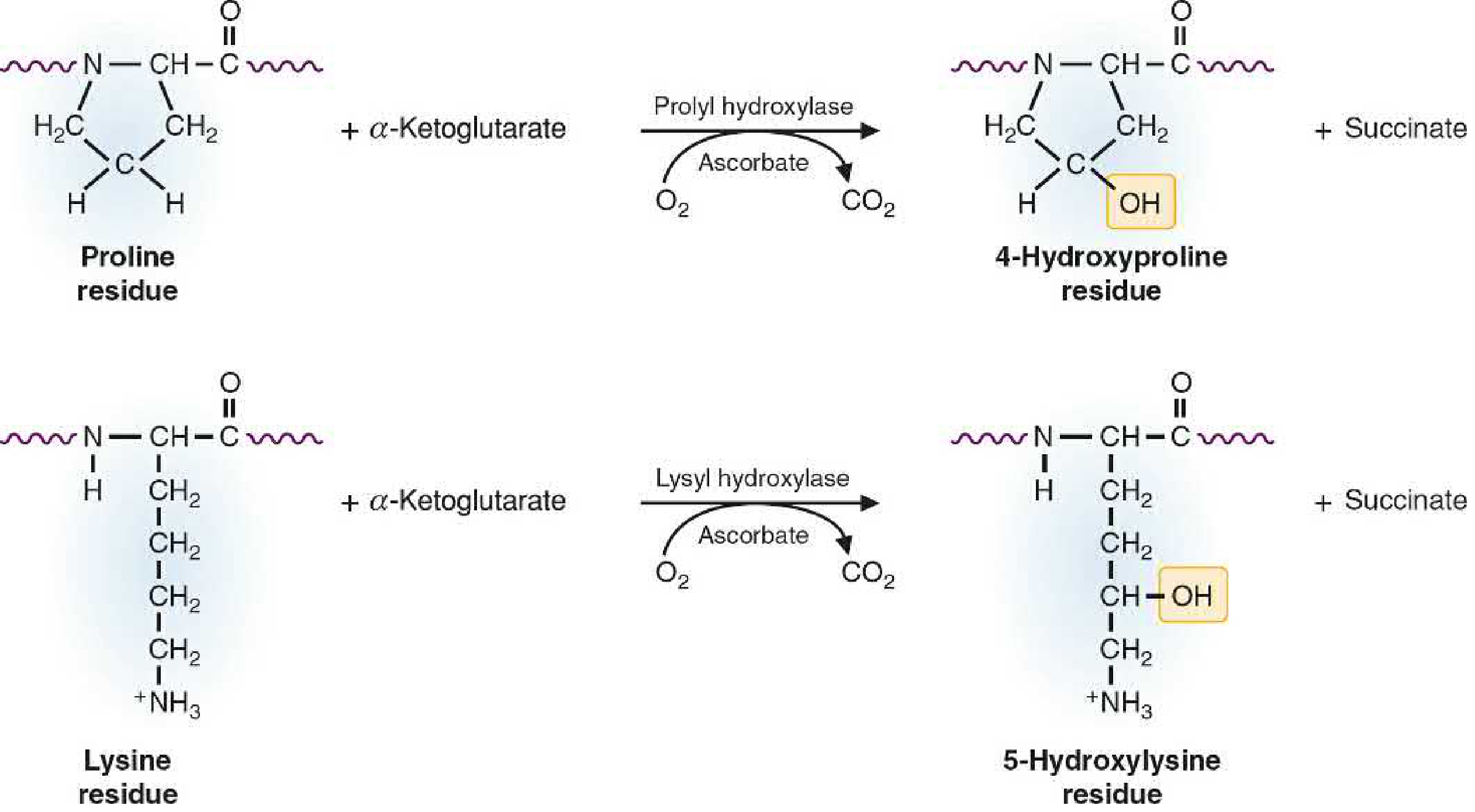 Hydroxylation reactions for proline and lysine in collagen synthesis, both requiring Vitamin C as cofactor — Basic Medical Biochemistry, 6e