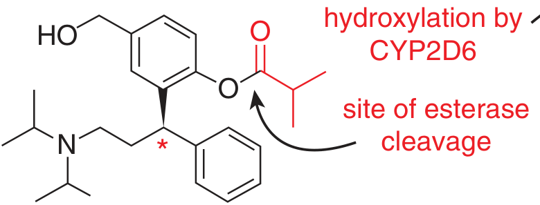 Fesoterodine (prodrug) — the ester bond is cleaved by non-specific plasma esterases to yield the active metabolite 5-HMT. CYP2D6 converts tolterodine to the same metabolite. (Goodman & Gilman, Fig. 11–4)