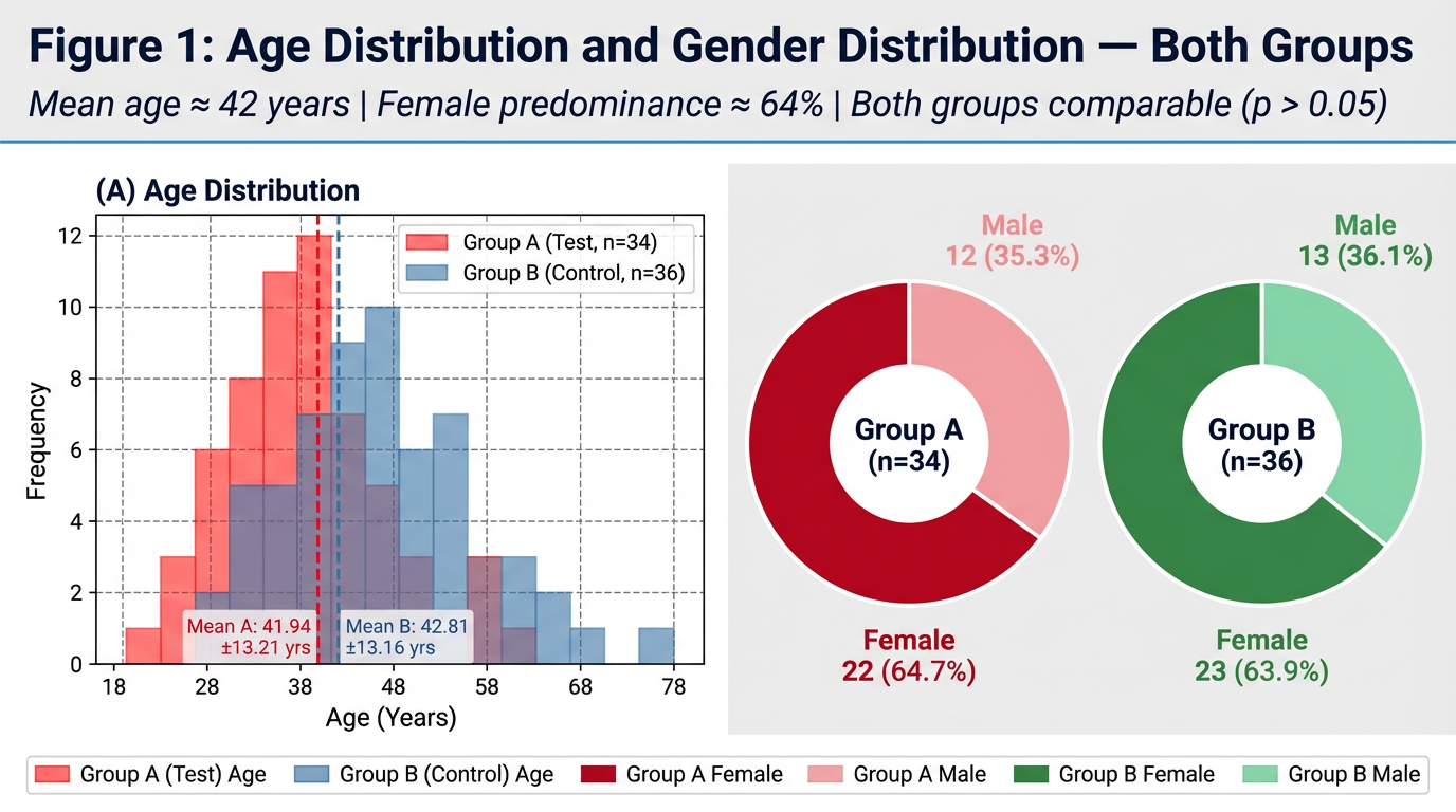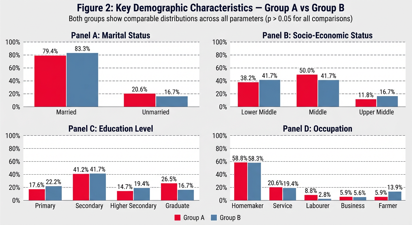 Table 1.2: Socio-Demographic Profile — Both Groups PARAMETER GROUP A (n=34) GROUP B (n=36) Test p Marital Status Married 27 (79.4%) 30 (83.3%) Fisher's Exact NS Unmarried 7 (20.6%) 6 (16.7%) Education Level Primary (up to Class 7) 6 (17.6%) 8 (22.2%) Chi-Square NS Secondary (Class 8–10) 14 (41.2%) 15 (41.7%) Higher Secondary (Class 11–12) 5 (14.7%) 7 (19.4%) Graduate and Above 9 (26.5%) 6 (16.7%) Occupation Homemaker 20 (58.8%) 21 (58.3%) Chi-Square NS Service 7 (20.6%) 7 (19.4%) Labourer 3 (8.8%) 1 (2.8%) Business 2 (5.9%) 2 (5.6%) Farmer 2 (5.9%) 5 (13.9%) Socio-Economic Status Lower Middle 13 (38.2%) 15 (41.7%) Chi-Square NS Middle 17 (50.0%) 15 (41.7%) Upper Middle 4 (11.8%) 6 (16.7%) NS = Not Significant (p > 0.05). Chi-Square or Fisher's Exact test as appropriate. SES = Socio-Economic Status assessed by modified Kuppuswamy scale. The majority of participants in both groups were married: Group A — 27 (79.4%); Group B — 30 (83.3%). Secondary education (Class 9–12) was the most common educational level: Group A — 14 (41.2%); Group B — 15 (41.7%). The occupation most frequently observed in both groups was homemaker: Group A — 20 (58.8%); Group B — 21 (58.3%), reflecting the largely semi-urban patient population attending the outpatient department. Service-sector employment was the second most common occupation in both groups (Group A: 7, 20.6%; Group B: 7, 19.4%). Regarding socio-economic status (SES) assessed by the modified Kuppuswamy scale, Middle SES was the dominant category in Group A (17 participants, 50.0%) while Lower Middle SES was dominant in Group B (15 participants, 41.7%). Upper Middle SES accounted for 11.8% of Group A and 16.7% of Group B. No participants from the Upper SES category were enrolled, consistent with the socio-economic profile of the outpatient department catchment area. No statistically significant difference was observed between groups for marital status, education, occupation, or SES (all p > 0.05). Figure 2: Key Demographic Parameters — Marital Status, Socio-Economic Status, Education Level, and Occupation. Both groups show comparable distributions across all parameters (p > 0.05 for all comparisons).write results n observations