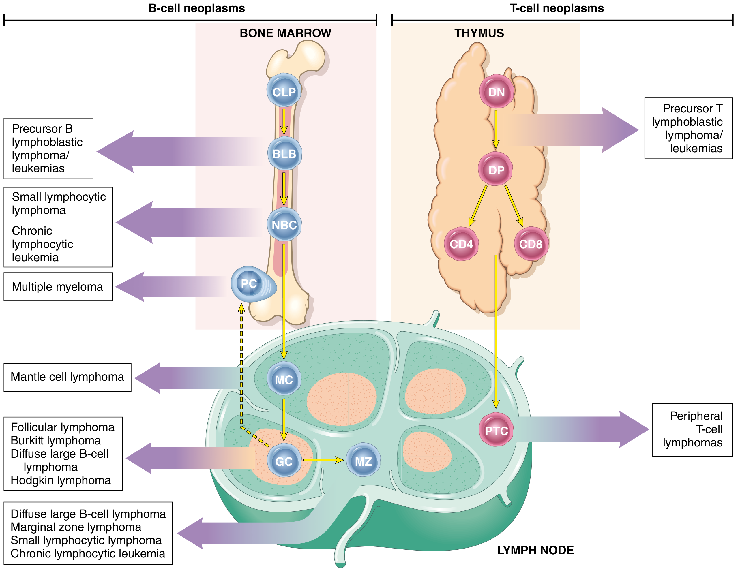 Fig. 1: Origin of lymphoid neoplasms. Stages of B- and T-cell differentiation from which specific lymphoid tumors emerge. BLB, Pre-B lymphoblast; CLP, common lymphoid precursor; GC, germinal center B cell; NBC, naïve B cell; PC, plasma cell; PTC, peripheral T cell. — Robbins & Kumar Pathologic Basis of Disease