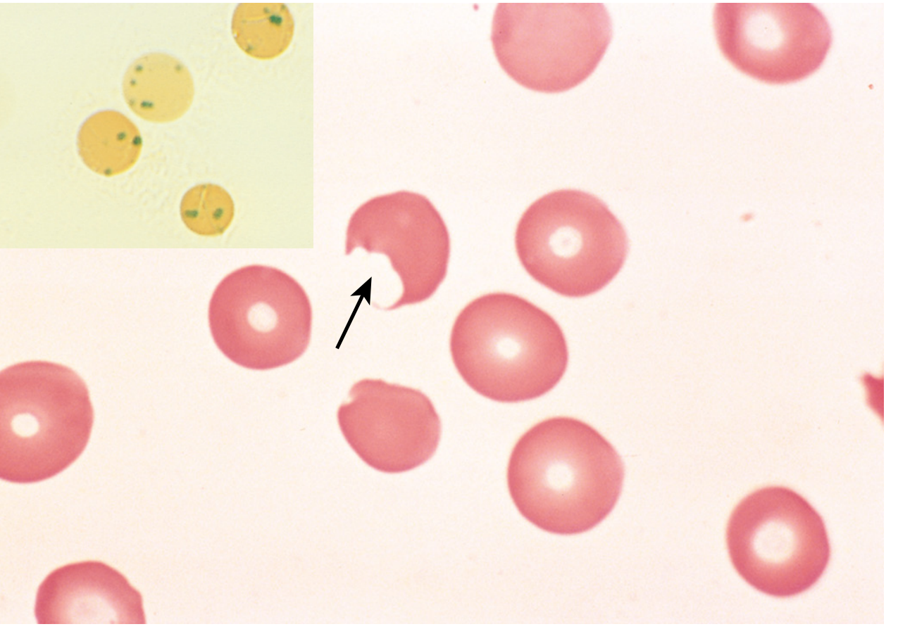 | Heinz bodies | Denatured Hb precipitates; seen with crystal violet or brilliant cresyl blue (supravital stain); NOT seen on routine H&E or Giemsa |