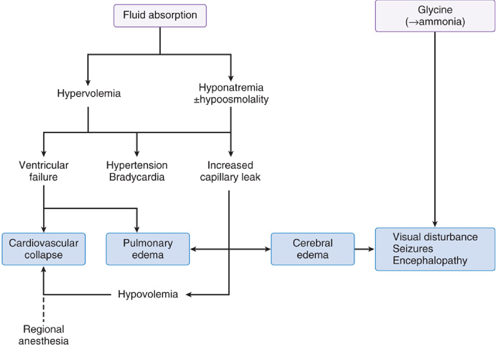 - Ammonia: glycine is hepatically deaminated to ammonia → encephalopathy; nausea/vomiting typically within 1 hour post-op; coma at high levels (10–12 hours duration)
