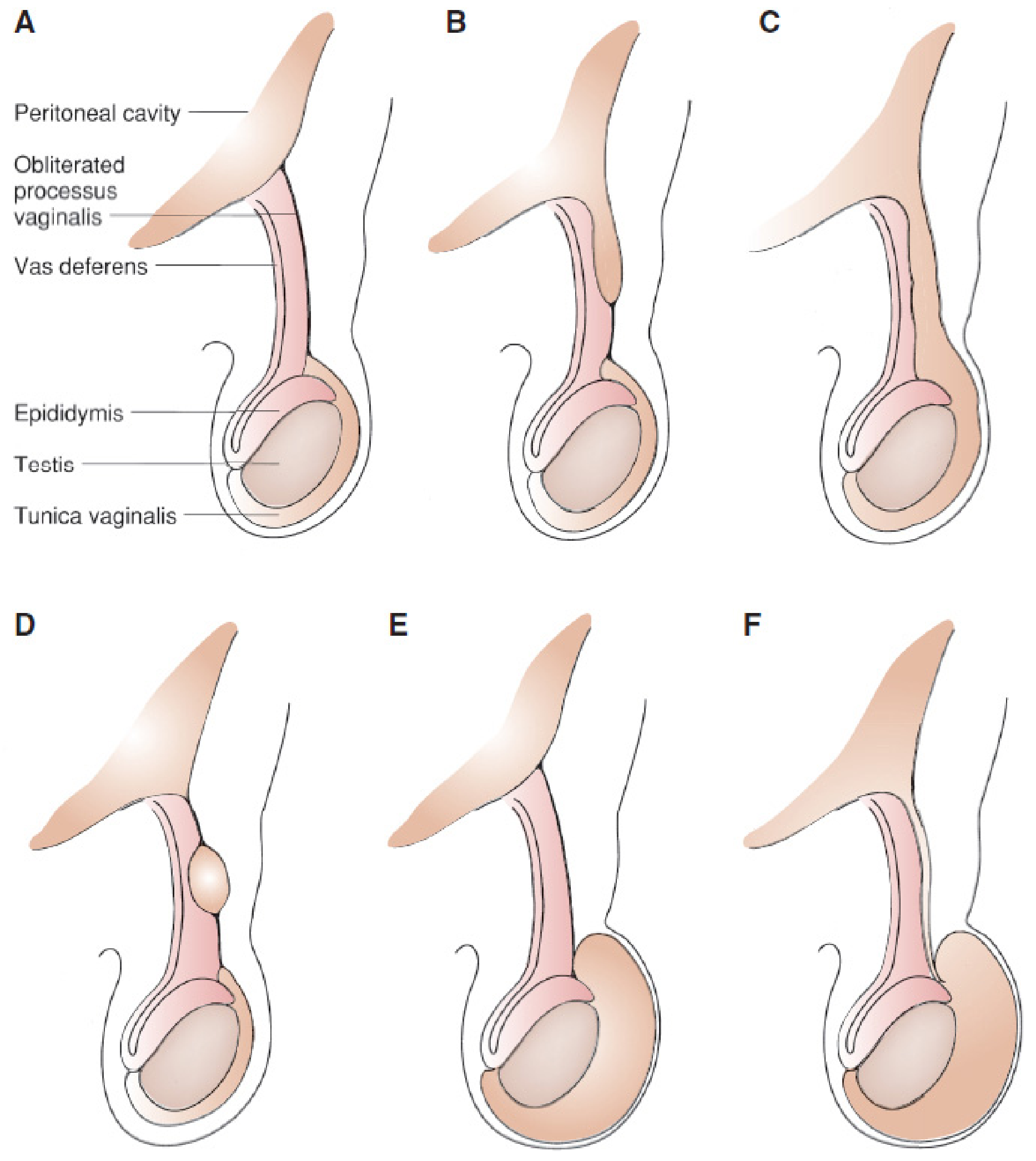 Figure: Anatomic variations with different degrees of obliteration of the processus vaginalis. (A) Normal. (B) Proximal hernia sac; distal obliterated. (C) Hernia sac extending into scrotum. (D) Hydrocele of the cord. (E) Scrotal hydrocele, obliterated processus. (F) Patent processus — communicating hydrocele. — Mulholland and Greenfield's Surgery, 7e