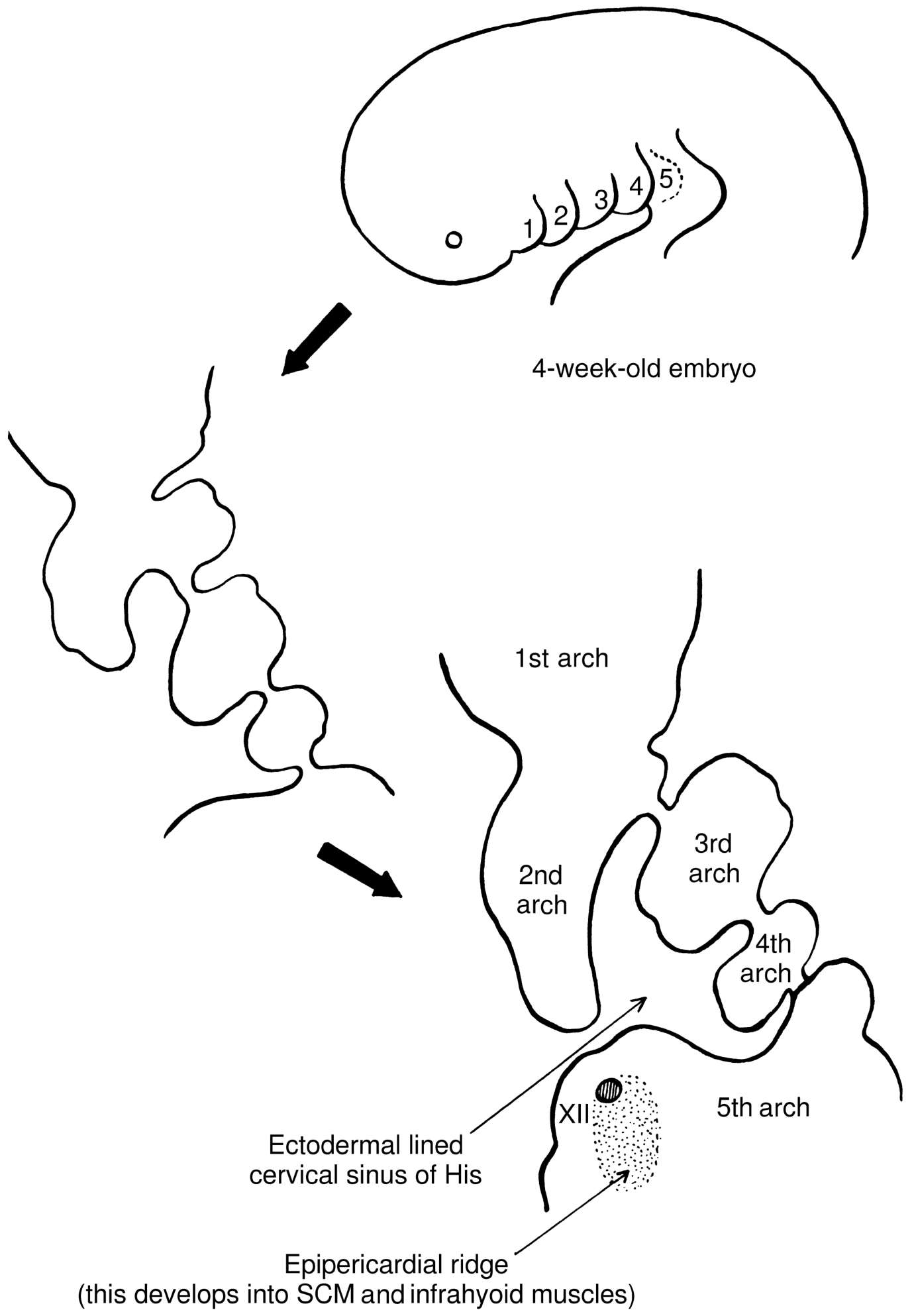 | 2nd arch (most common, 90%) | Cervical sinus / 2nd pharyngobranchial duct | Deep to 2nd arch derivatives, superficial to 3rd arch derivatives; superficial to CN XII, anterior to SCM; between internal and external carotid arteries; deep to stylohyoid ligament | Tonsillar fossa |