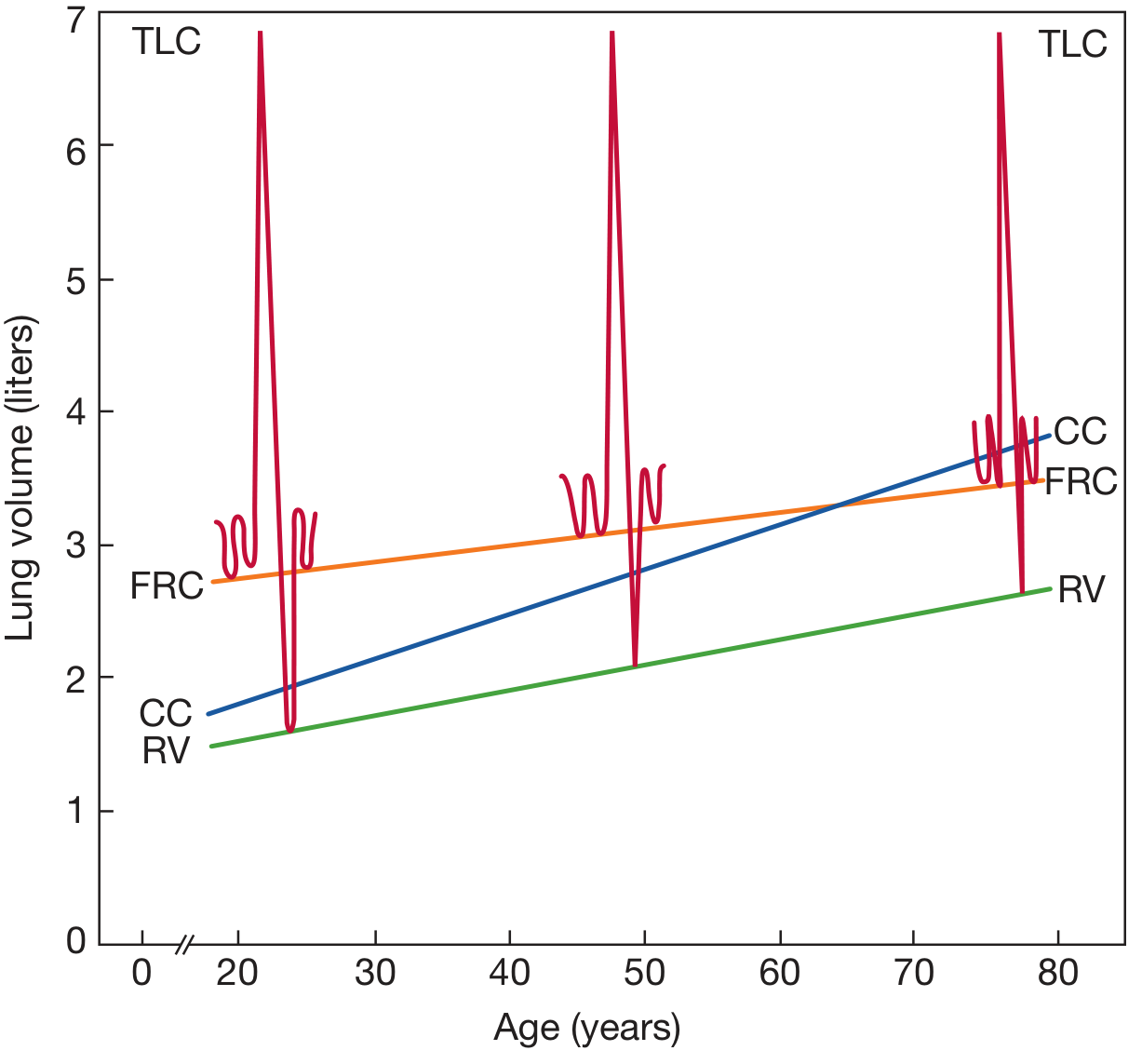 - Closing capacity (CC) rises faster than FRC with age.
