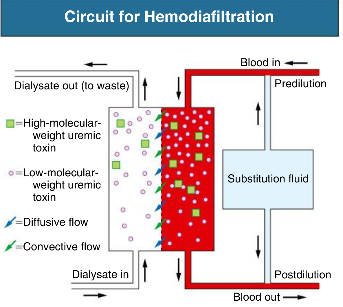 Circuit for Hemodiafiltration — substitution fluid can be administered predilution (upstream) or postdilution (downstream) of the dialyzer. Blue arrows = diffusive flow; green arrows = convective flow.