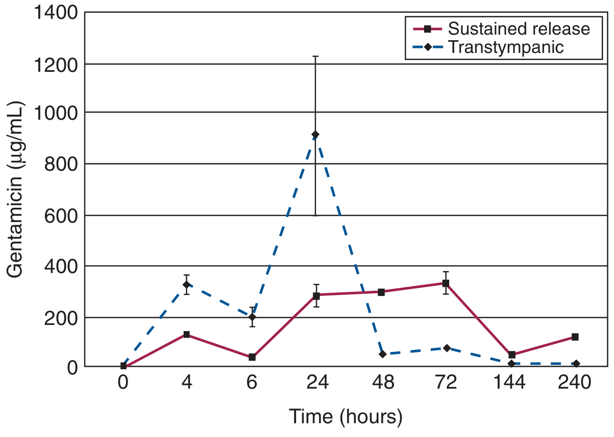 Perilymph gentamicin concentration curves — transtympanic injection (dashed, rapid peak with high variability by 48h) vs. sustained release (solid, sustained plateau for 72+ hours). Note the large standard error bars for transtympanic delivery. — Cummings Otolaryngology