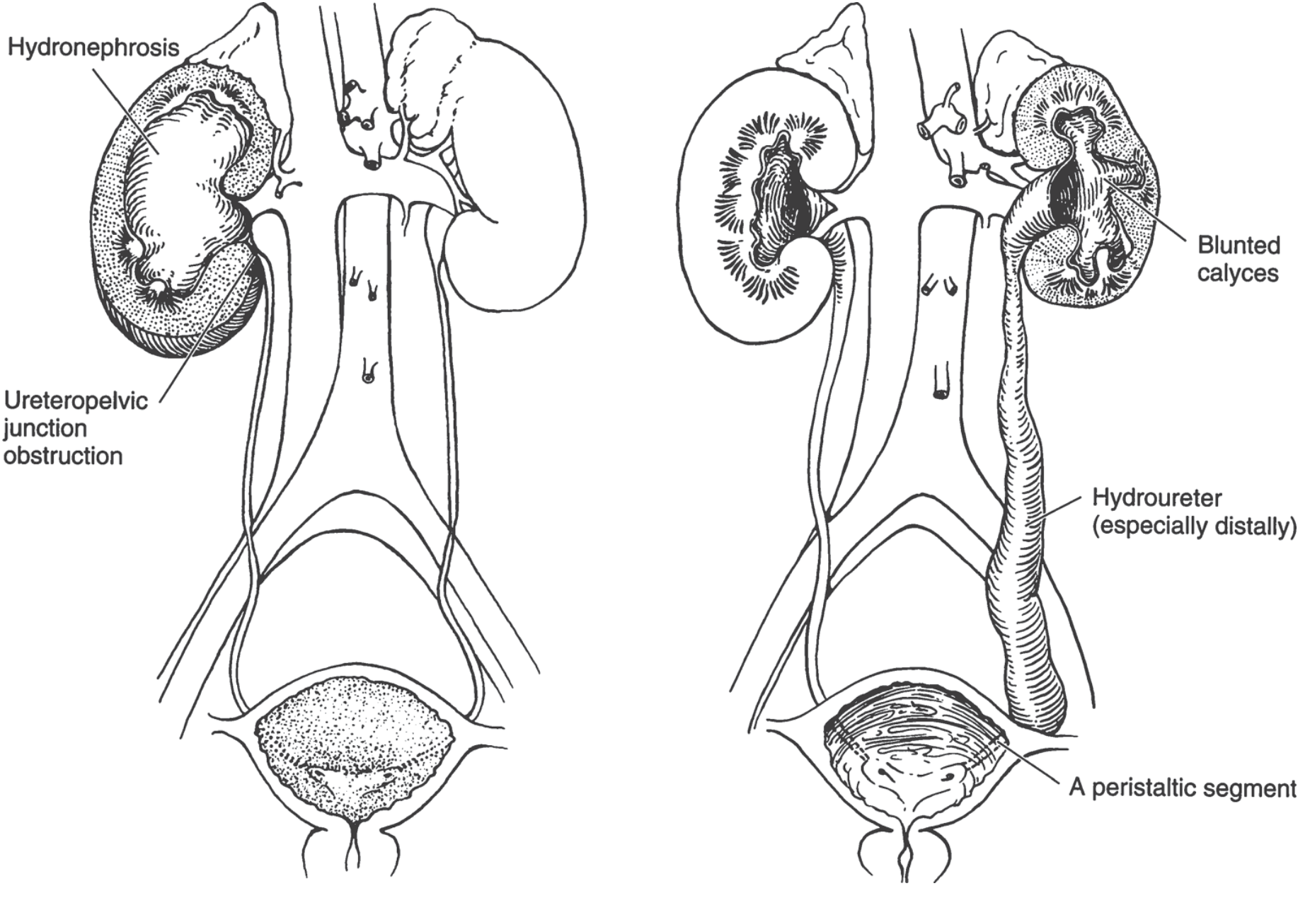 Figure 37-9. Congenital ureteral obstruction. Left: UPJ obstruction → hydronephrosis (ureter normal). Right: UVJ obstruction (obstructed megaureter) → ureterohydronephrosis with hydroureter (especially distally) and blunted calyces. — Smith and Tanagho's General Urology, 19th Edition