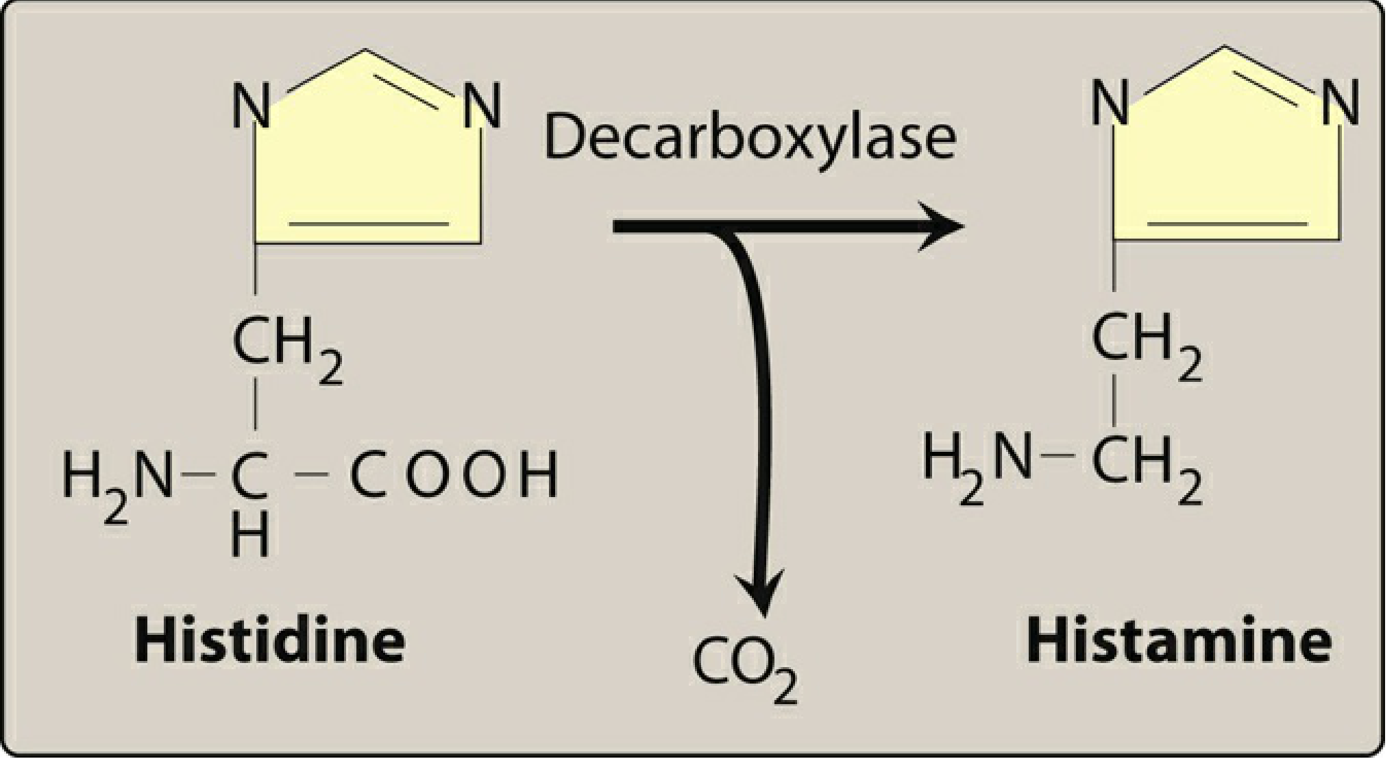 Histamine is the primary mediator of allergic reactions. It is synthesized by decarboxylation of histidine (by histidine decarboxylase) and stored in mast cells and basophils. On release, it binds to H1 and H2 receptors causing the spectrum of allergic symptoms.
