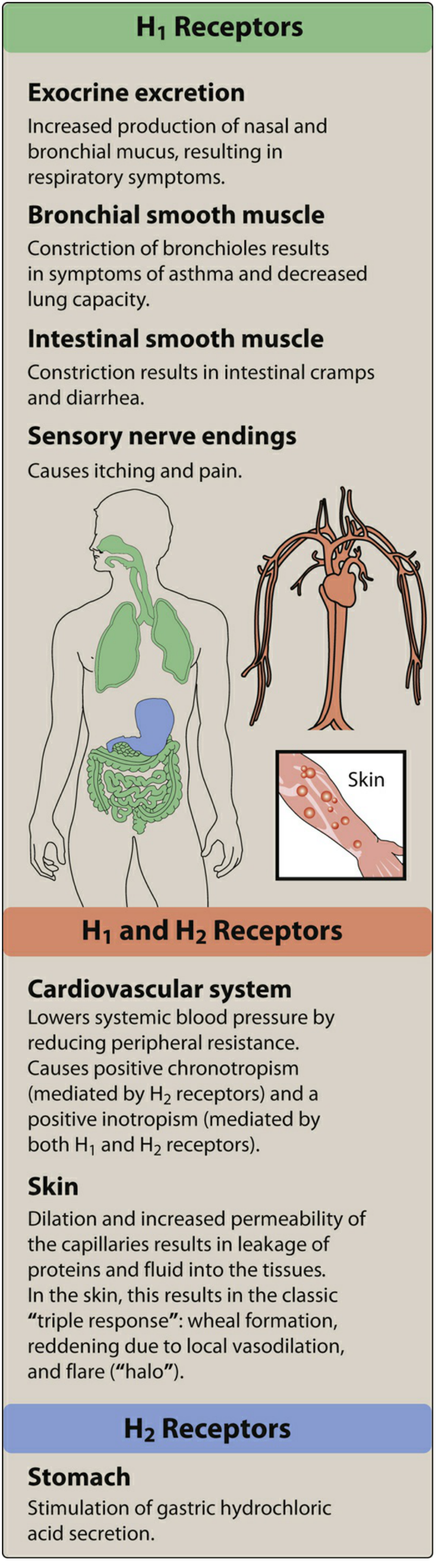 H1 receptor effects: Smooth muscle contraction, ↑ capillary permeability, vasodilation (via NO), bronchoconstriction, pruritus