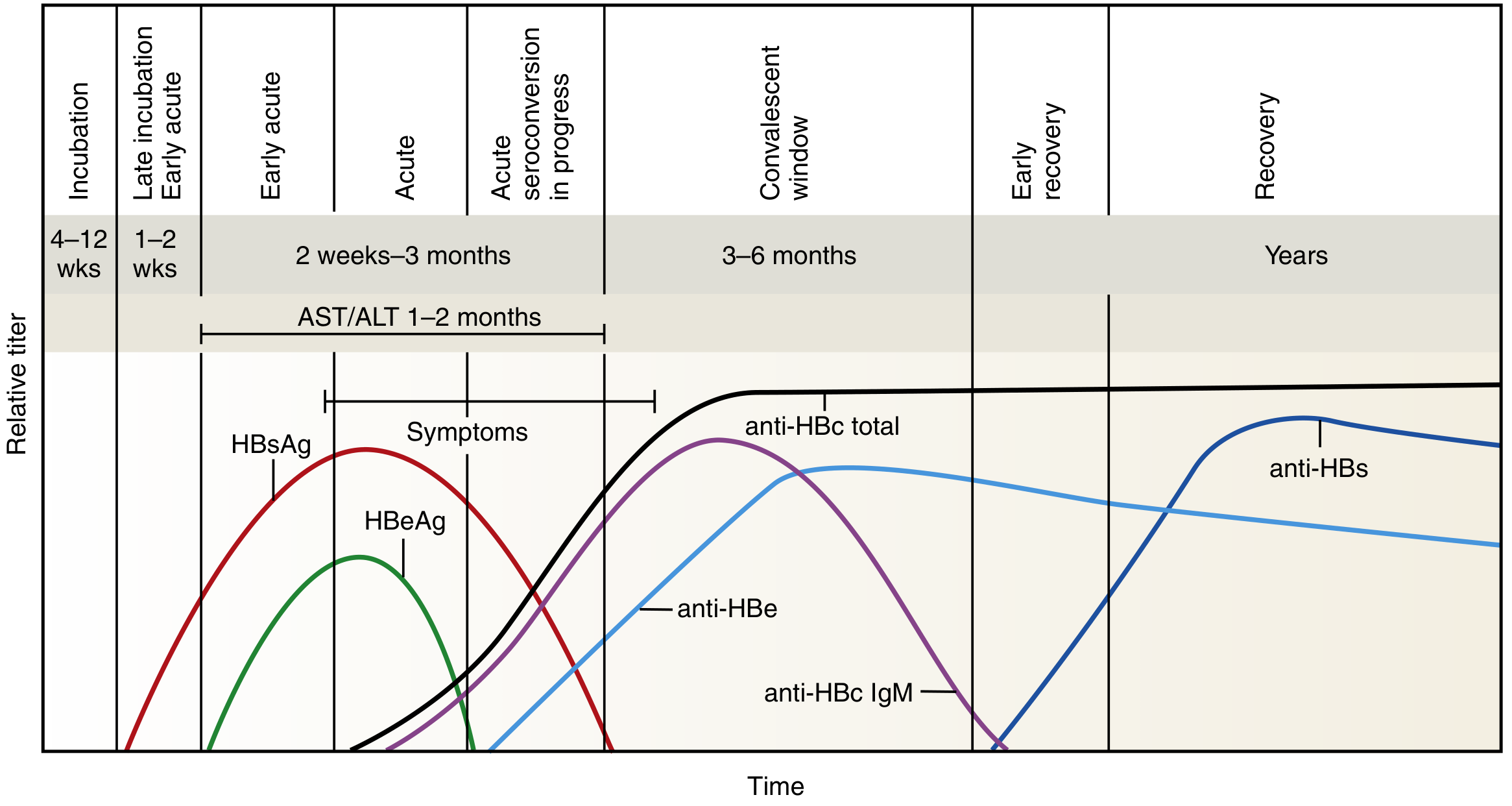A gap (~3–6 months) exists where HBsAg has disappeared but anti-HBs has not yet risen. During this period, IgM anti-HBc and anti-HBe are the only markers of infection.
