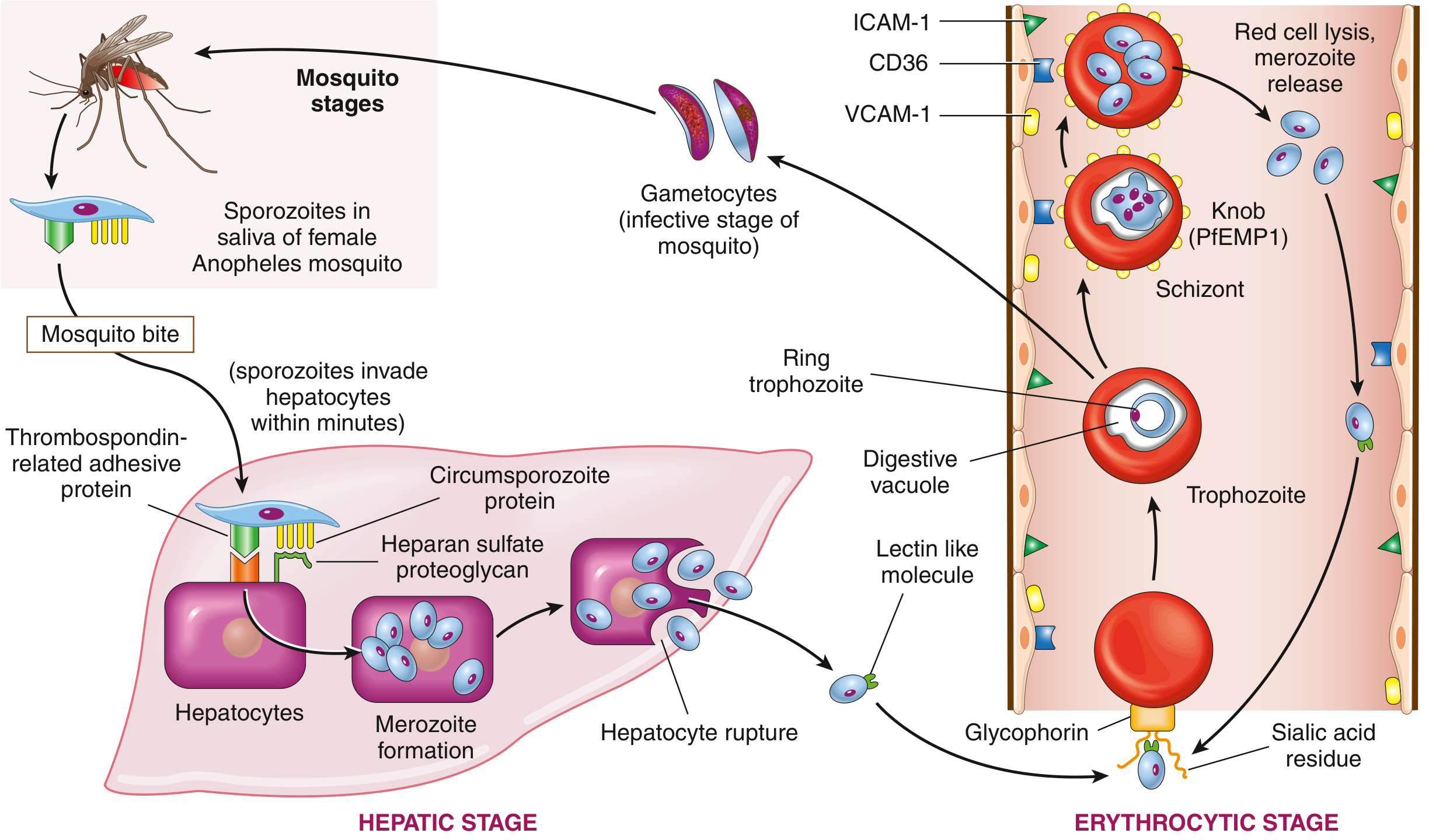 - A lectin-like molecule on the merozoite surface binds to sialylated glycophorin (a red cell transmembrane protein), allowing the merozoite to invaginate into the RBC within a "digestive vacuole."