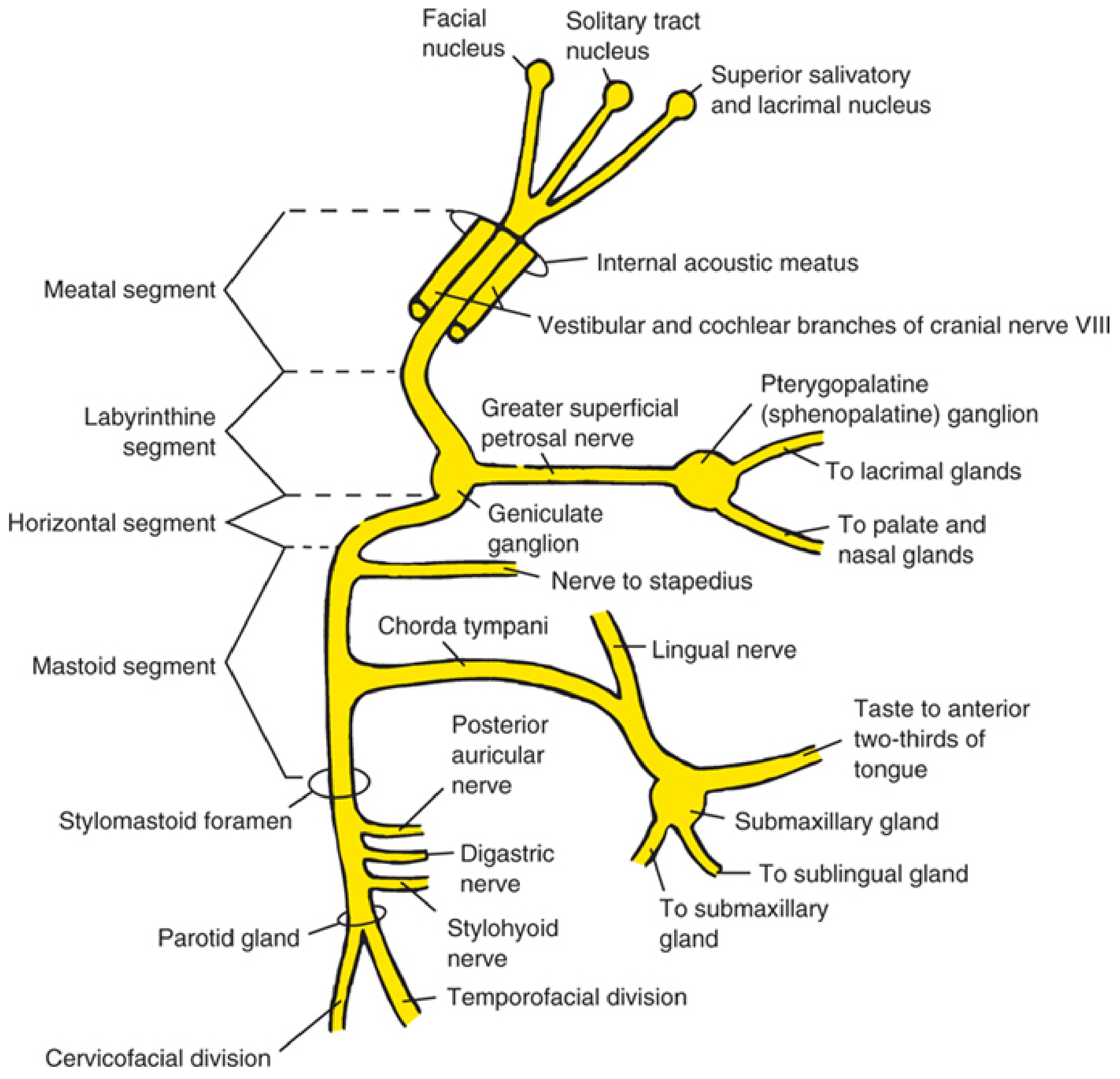 Fig. 1: Schematic of CN VII showing all segments, nuclei, branches, and autonomic connections — Cummings Otolaryngology Head and Neck Surgery