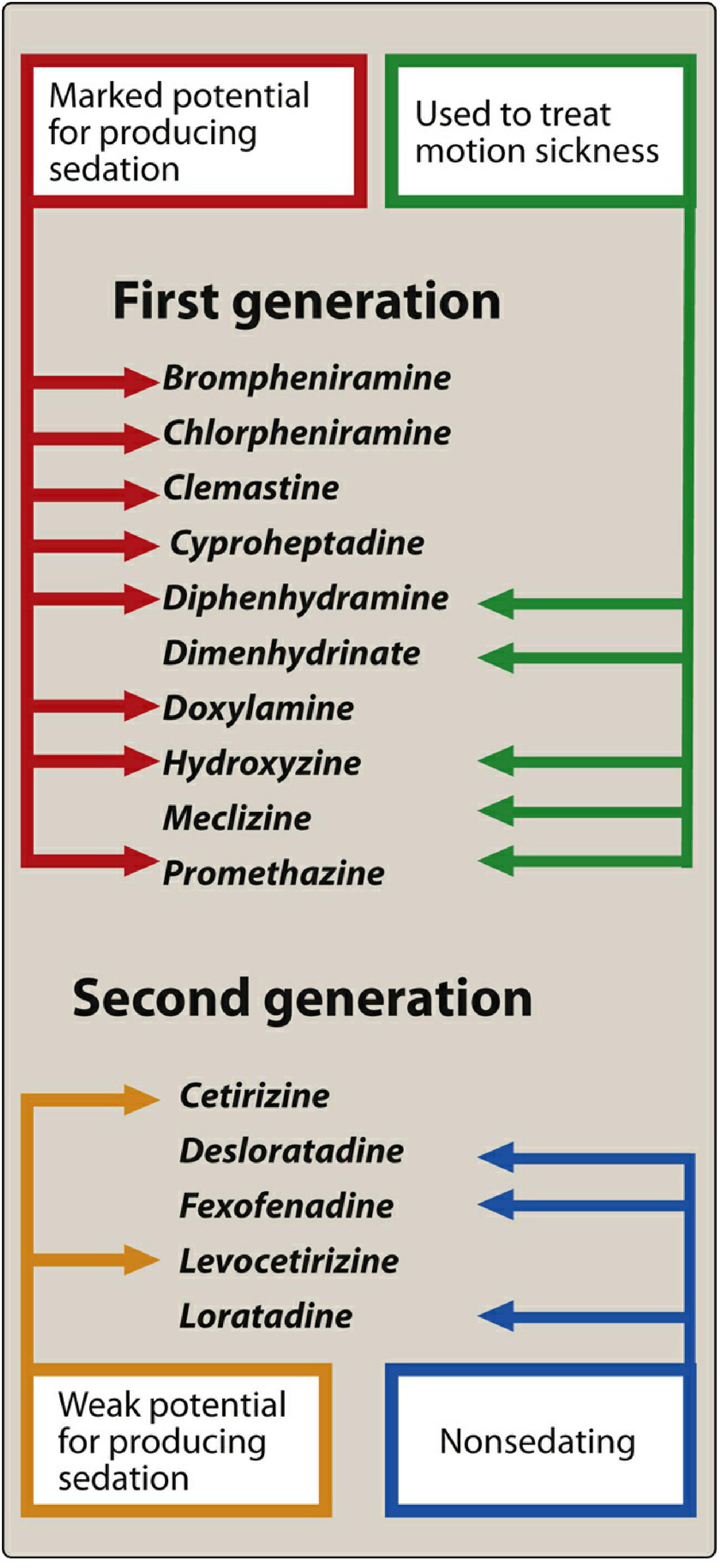 - Motion sickness (meclizine, promethazine, diphenhydramine)