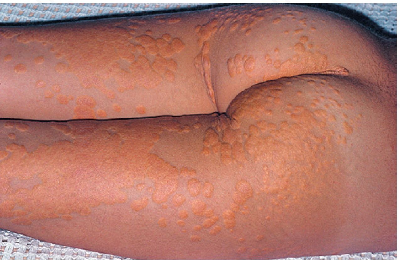- Tuberous/tuberoeruptive xanthomas — over elbows, knees