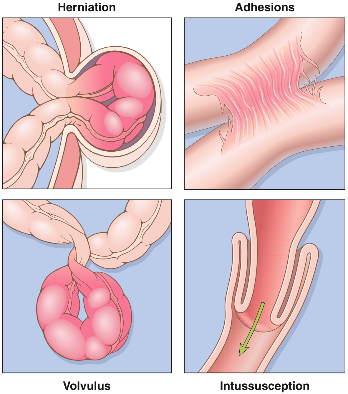 - Internal hernias: Paraduodenal, foramen of Winslow, mesenteric, obturator