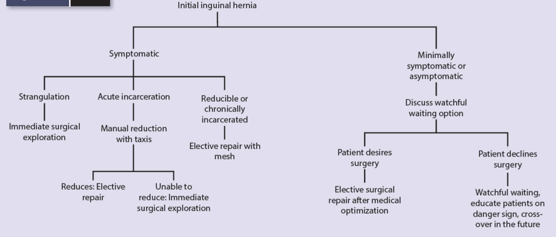 | Femoral | McVay (open) or laparoscopic TAPP/TEP; timely repair due to high strangulation risk |