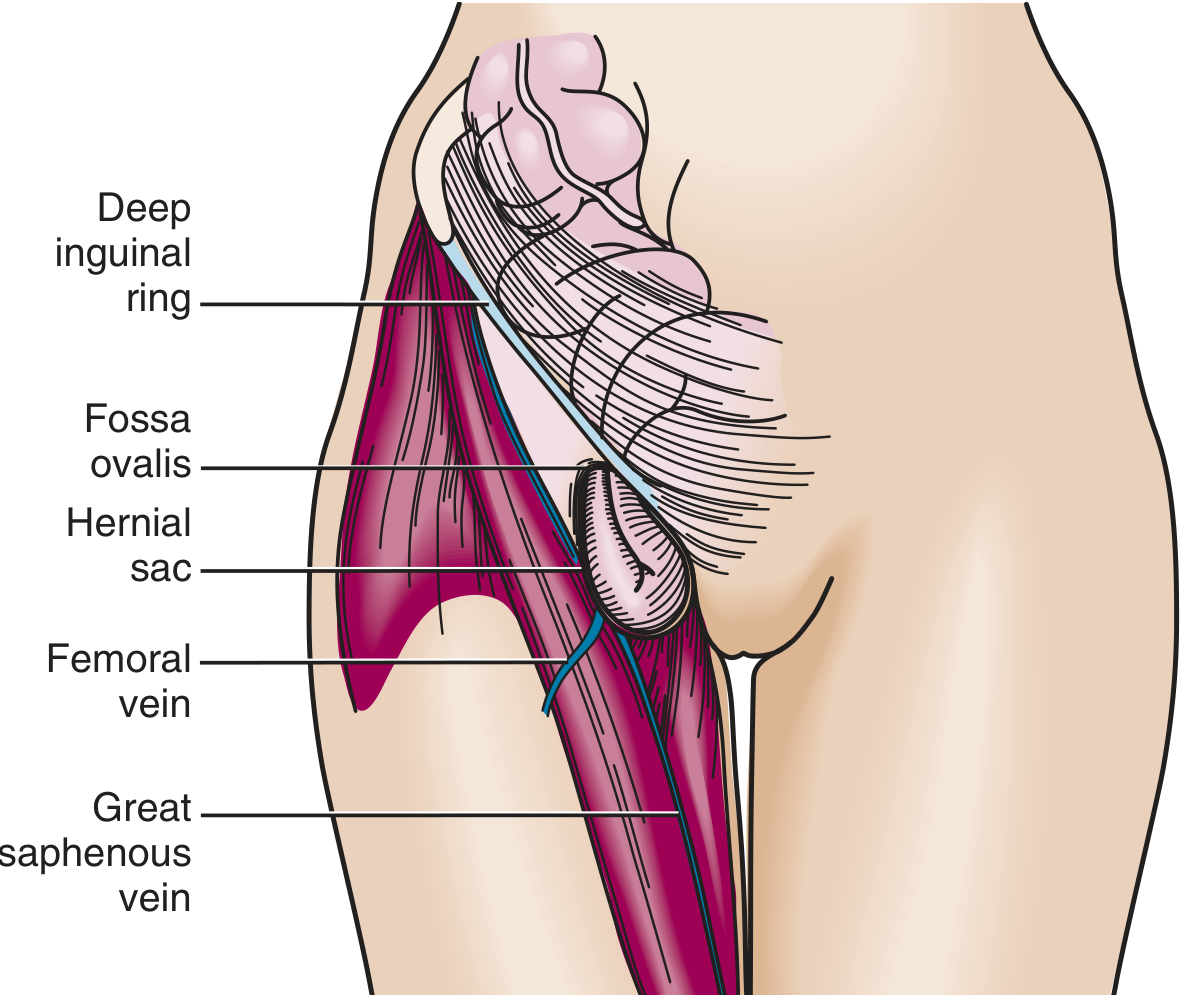 - Anatomy: Protrudes inferior to the inguinal ligament through a defect in the transversalis fascia, into the femoral canal (medial to femoral vein, lateral to lacunar ligament). Presents as a medial thigh mass, below and lateral to the pubic tubercle.