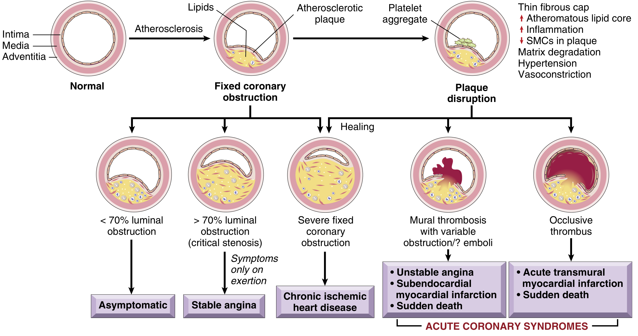 - Thrombus formation — platelet aggregation and clotting at the rupture site creates an occlusive thrombus, completely blocking blood flow.