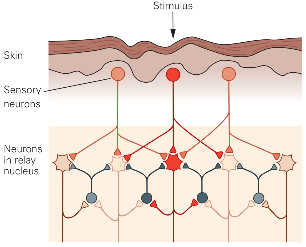 - A stimulus to the skin activates the most strongly stimulated relay neuron at the center of the array (shown in red above)