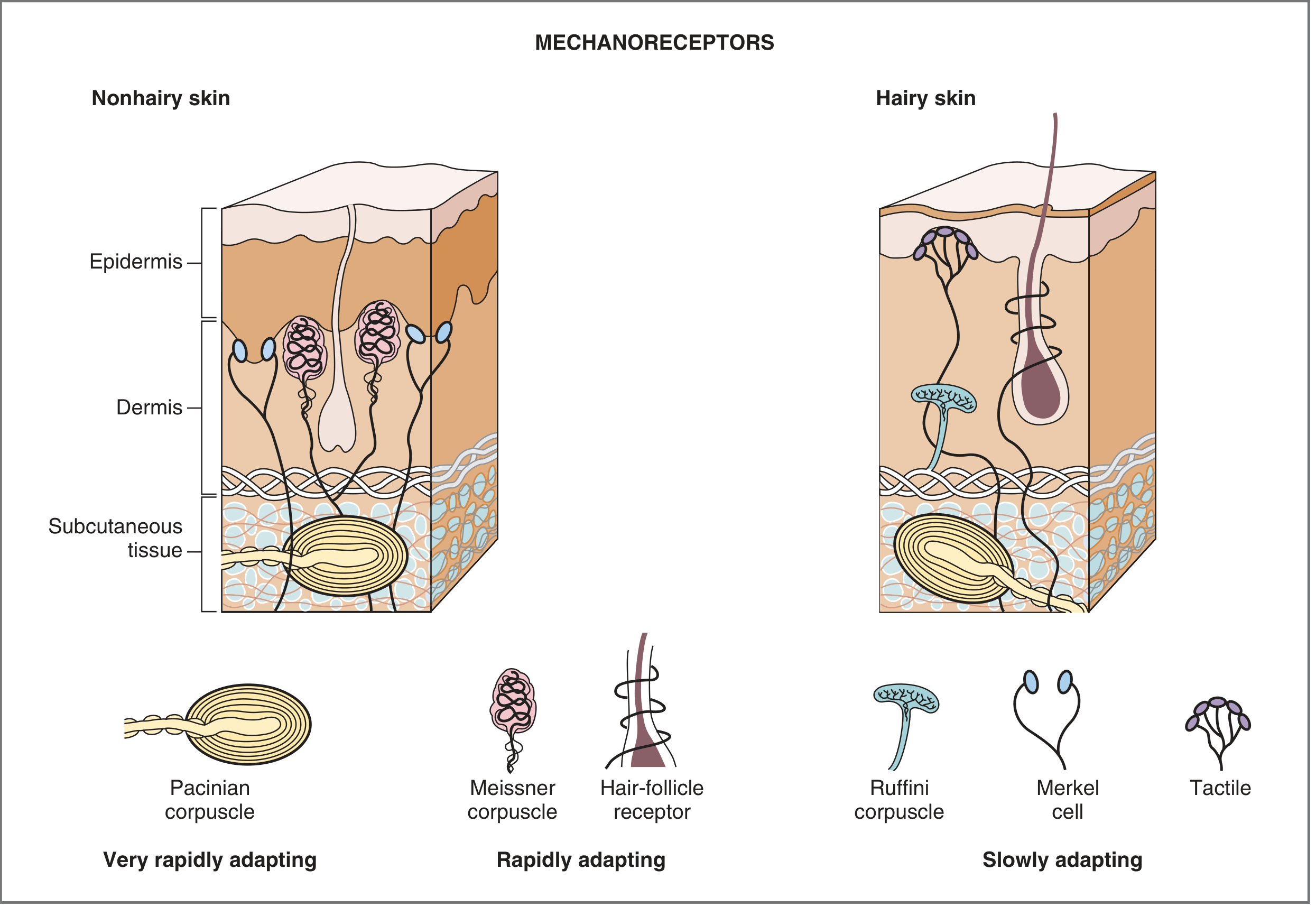 | Pacinian corpuscle | Deep subcutaneous tissue | Very rapidly | Vibration, tapping |