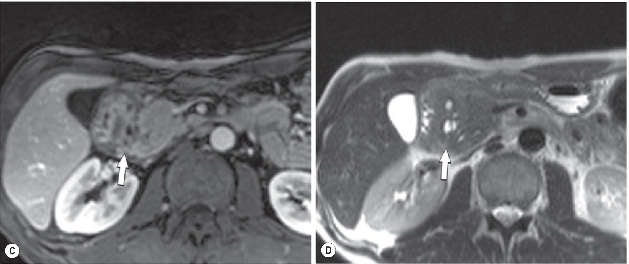 Fig. 25.23 C-D (Grainger & Allison's) — Gadolinium-enhanced T1 shows hypovascular groove mass (C, arrow); T2 shows the characteristic cysts (D, arrow):