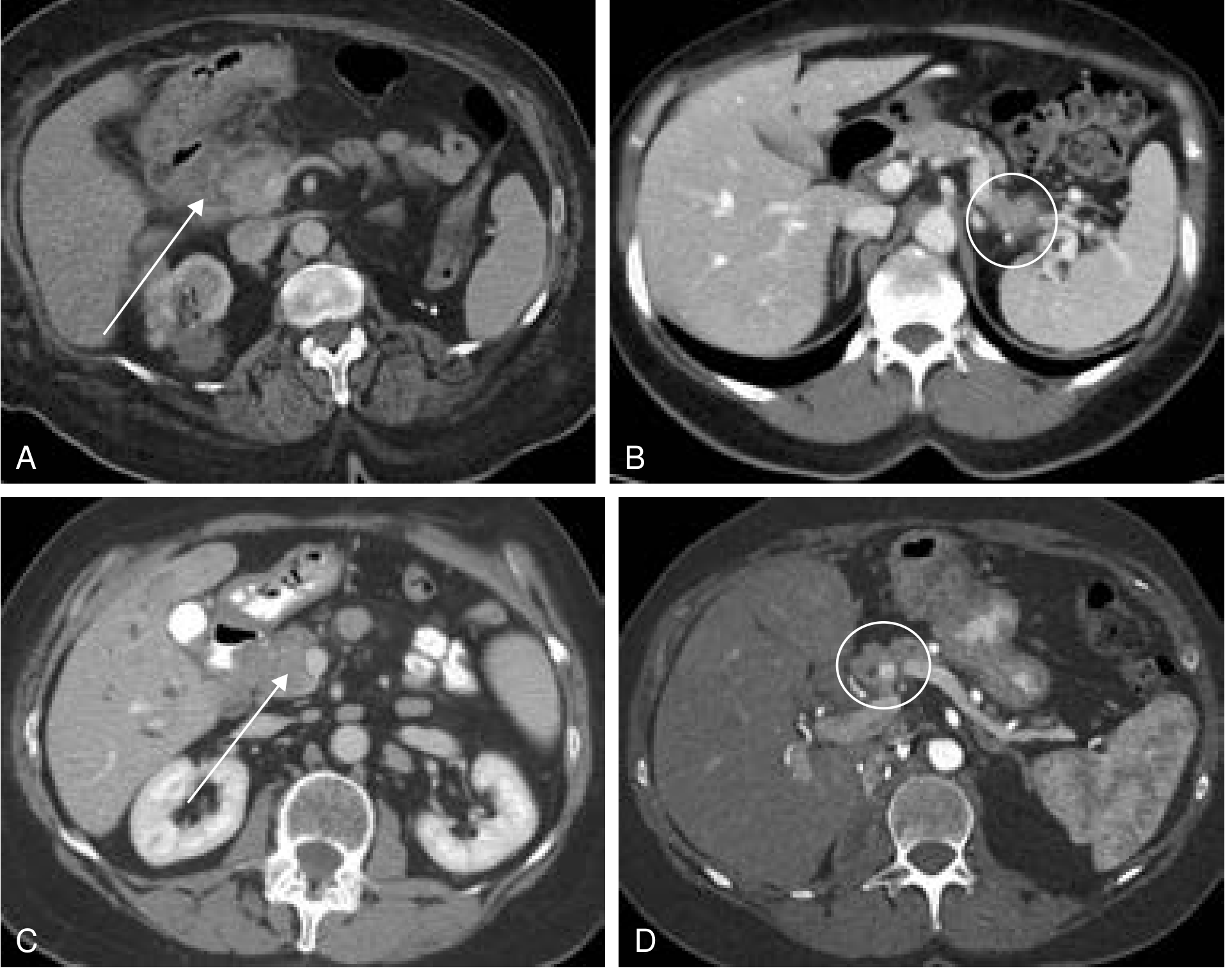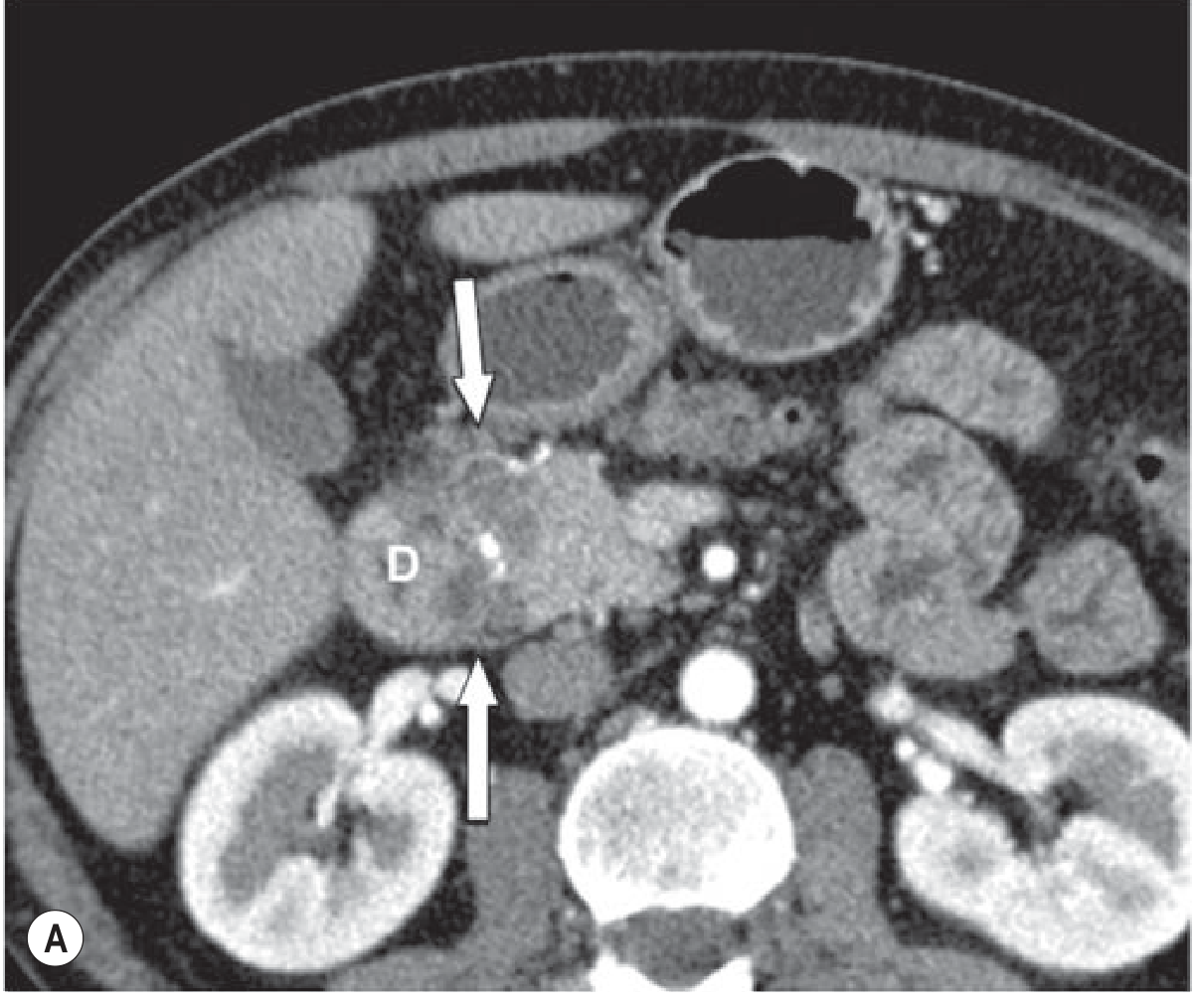 - Groove-predominant form: plate-like, hypoattenuating (low-density), poorly enhancing lesion situated between the pancreatic head and the descending duodenum (labeled "D" in the CT below — arrows point to the mass)
