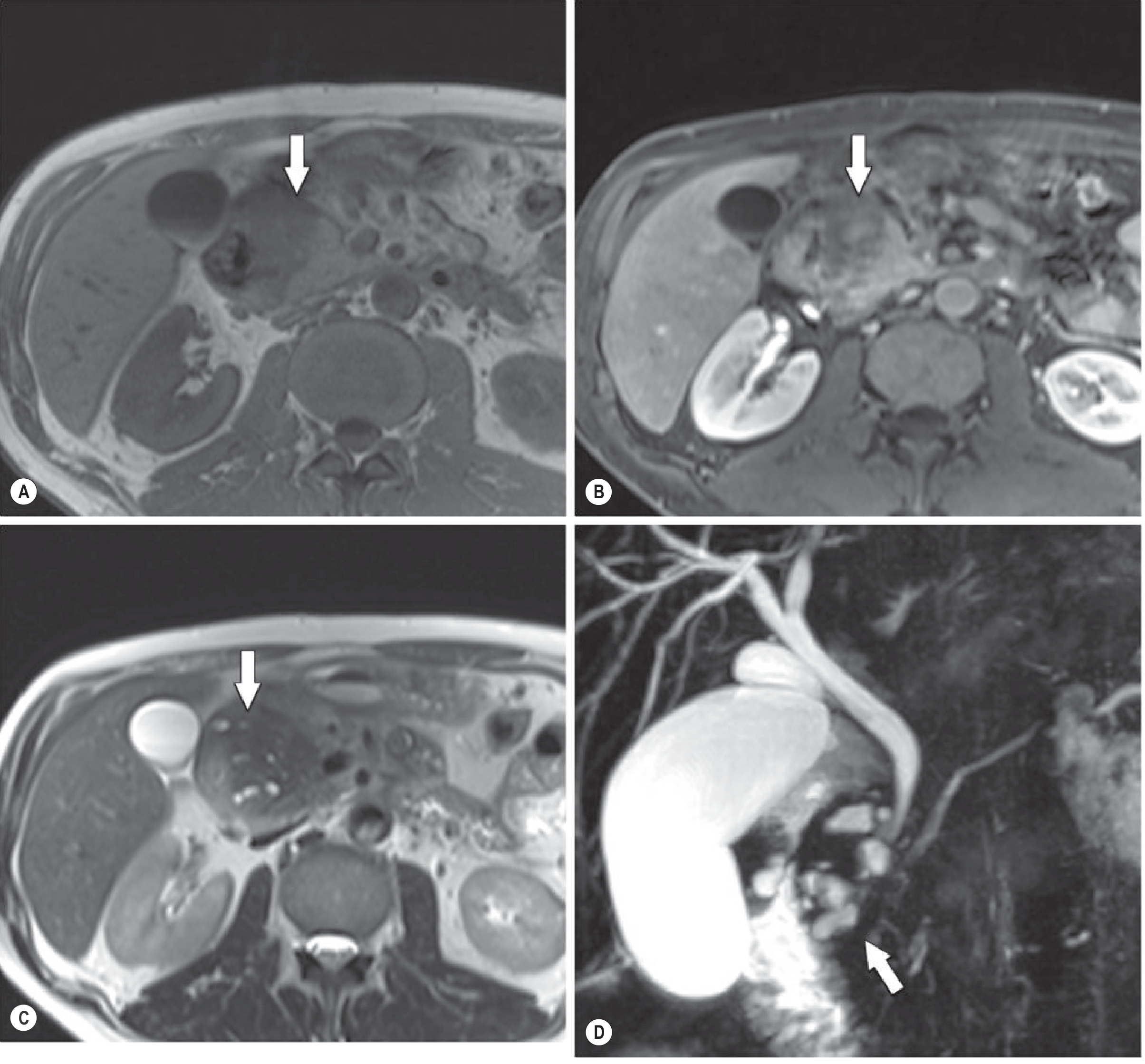 Fig. 25.24 (Grainger & Allison's) — Segmental form: T1 in-phase (A) and gadolinium-enhanced T1 (B) show a large mass involving the pancreatic head (arrows); T2 (C) shows multiple small cysts in the groove and head; MRCP (D) delineates the cysts clearly (arrow):