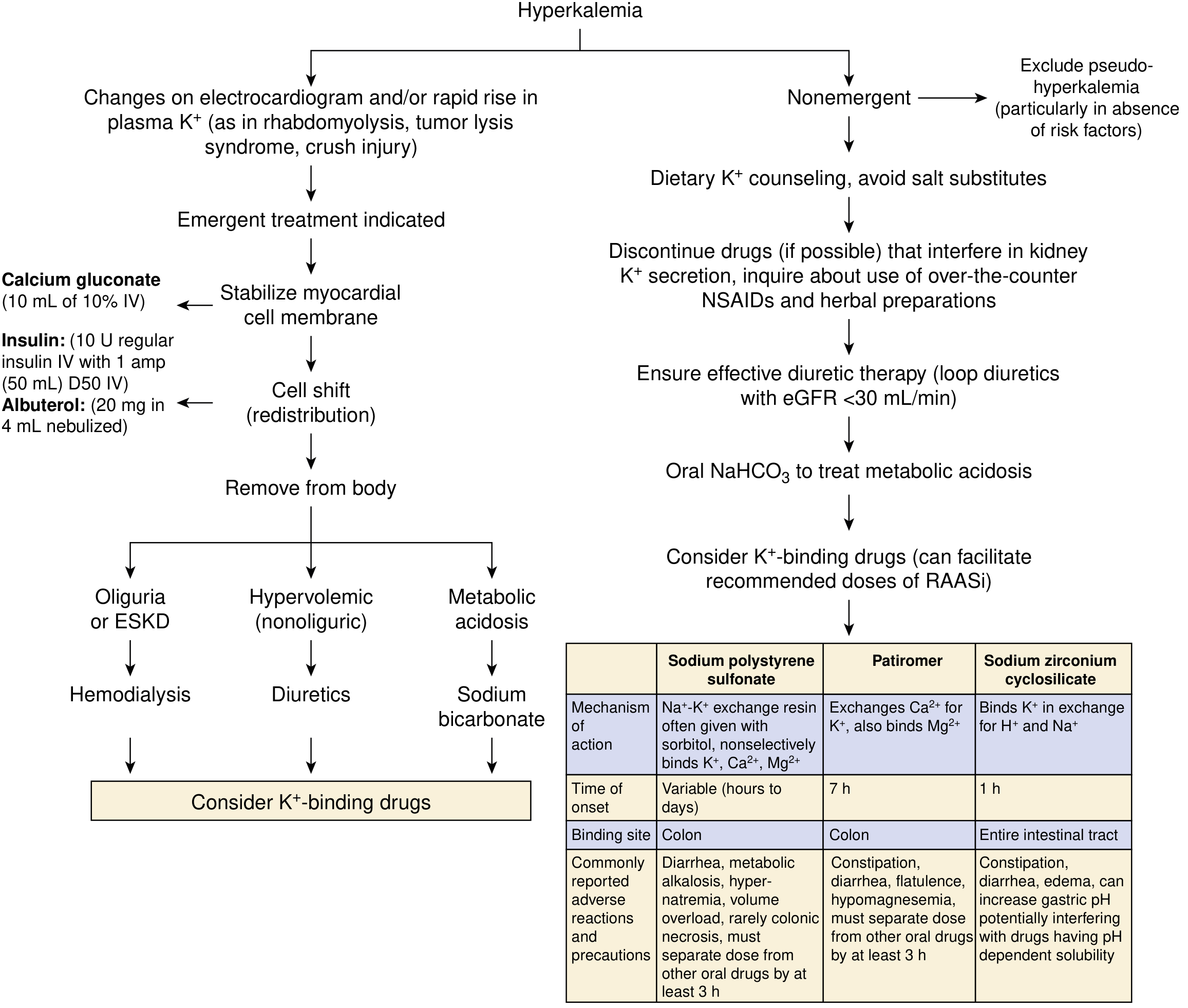 | Sodium polystyrene sulfonate (Kayexalate) | Adjunct/transition | 50 g PO in sorbitol or enema; onset hours–days; risk of colonic necrosis |