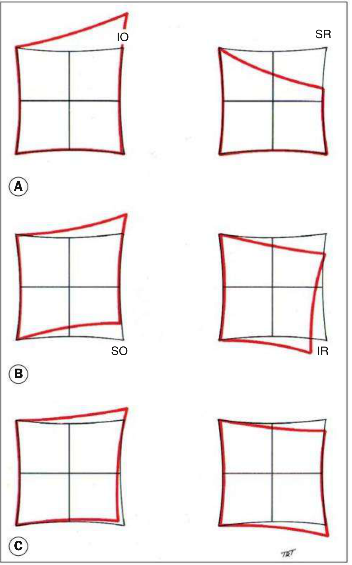 (A) Underaction of right SR + overaction of left IO; (B) secondary overaction of right IR → inhibitional palsy of left SO; (C) concomitant charts — original palsy indeterminate.