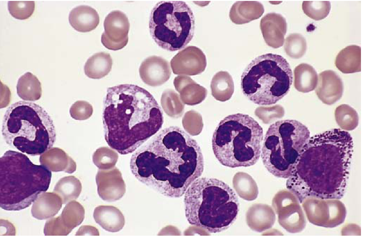 Fig. 10.16 — CML peripheral blood smear. Note granulocytes at various maturation stages. (Robbins & Kumar Basic Pathology)